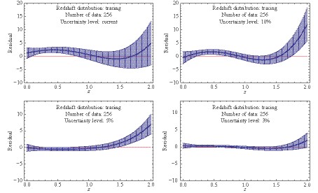 • To test the fidelity of the GaPP, we appeal to the residual of the fiducial model on which simulations are based and the function reconstructed from the corresponding mock data to characterize the deviation between them. Results related to this quantity for both simulations of expansion rate measurements and distance observations are presented in Figs. 7-9. In our analysis, it is almost certain that the GaPP is less invalid as differences of the reconstructed function from the true model deviate significantly from the horizontal line (Residual = 0). For the Hubble parameter vs. redshift, as suggested in these plots, the validity of the GaPP increases with an increase in the number of simulated data points. On the contrary, the uncertainty level of mock data is also crucial for the fidelity of reconstruction. That is, the GaPP is more valid for reconstructing data with smaller relative uncertainties. In particular, as indicated from the upper-left panel of Fig. 7 for the mock data including 64 points with the current quality, the GaPP reconstruction significantly deviates from the fiducial model. For the case of 128 points with 3% relative uncertainty (the lower-right panel of Fig. 8), the reconstructed function is in good agreement with the fiducial model. Moreover, from the lower-right panel of Fig. 9, we find that the GaPP reconstruction is perfectly consistent with the fiducial scenario at $ 1\sigma $ confidence level when the dataset containing 256 events with a relative 3% uncertainty is considered. For ~4000 forthcoming distance estimations of DES SNe Ia, except for the range z<0.2, the reconstructed distance-relation is very close to the one in the fiducial model (as shown inFig. 10). This is because, according to the DES program, there are only a small amount of SNe Ia to be observed in the redshift range z<0.2.
