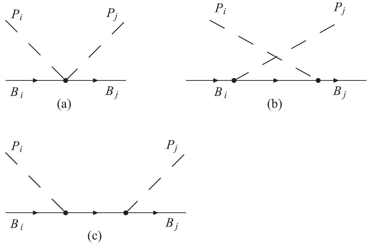 Figure 1.  Feynman diagrams of the pseudoscalar meson-baryon octet interaction. ${\rm (a)}$ contact term, ${\rm (b)}$ $u-$ channel and ${\rm (c)}$ $s-$ channel.