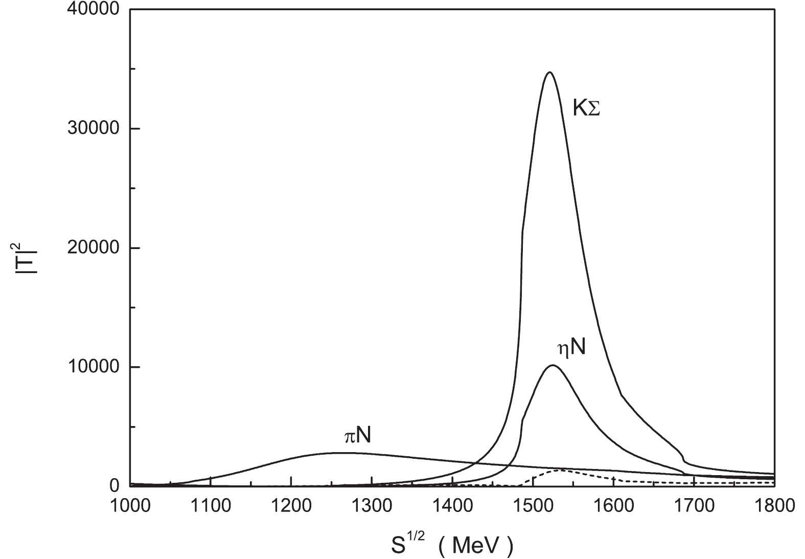 Figure 4.  The amplitude squared $|T|^2$ as a function of the total energy $\sqrt{s}$ for different channels with isospin $I=1/2$ and strangeness $S=0$. The $\pi N$, $\eta N$ and $K\Sigma$ channels are labeled in the figure, while the $K \Lambda$ channel is drawn with the dashed line.