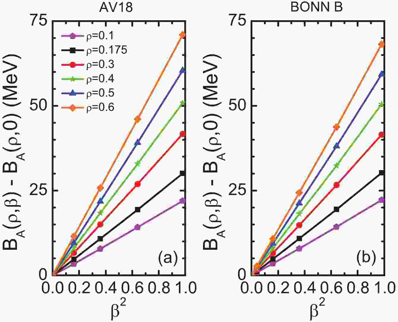 $ \Delta U(\rho,\beta)_{ST} = U(\rho,\beta)_{ST}-U(\rho,0)_{ST} $ with the Bonn B potential. With 2BF only (left side of Fig. 3), all components exhibit a linear behavior in$ \beta^2 $ up to high density. Such a result was expected from the discussion following Eq. (3). A small deviation in$ U_{01} $ is irrelevant for the behavior of the total potential energy.
