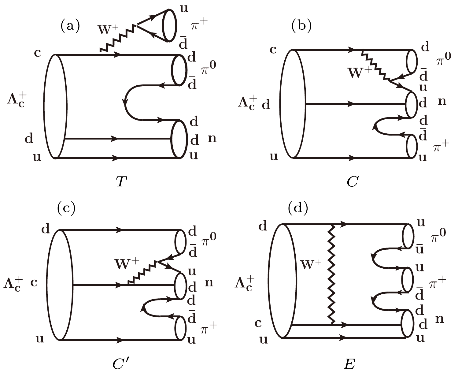 $\Lambda_c^+ \to n\pi^+\pi^0$ via (a) external$W$ -emission$T$ , (b) internal$W$ -emission$C$ , (c) inner$W$ -emission$C^{\prime}$ , and (d)$W$ -exchange diagram$E$ .In addition, an alternative and model-inpendent approach based on quark flavor SU(3) symmetry has been proposed to describe charmed-baryon decays. Even though it is an approximate method, it is a powerful and reliable tool to extract useful information about these transitions [3–10]. Improved measurements of charmed-baryon decays will be important in further testing the validity of this method.