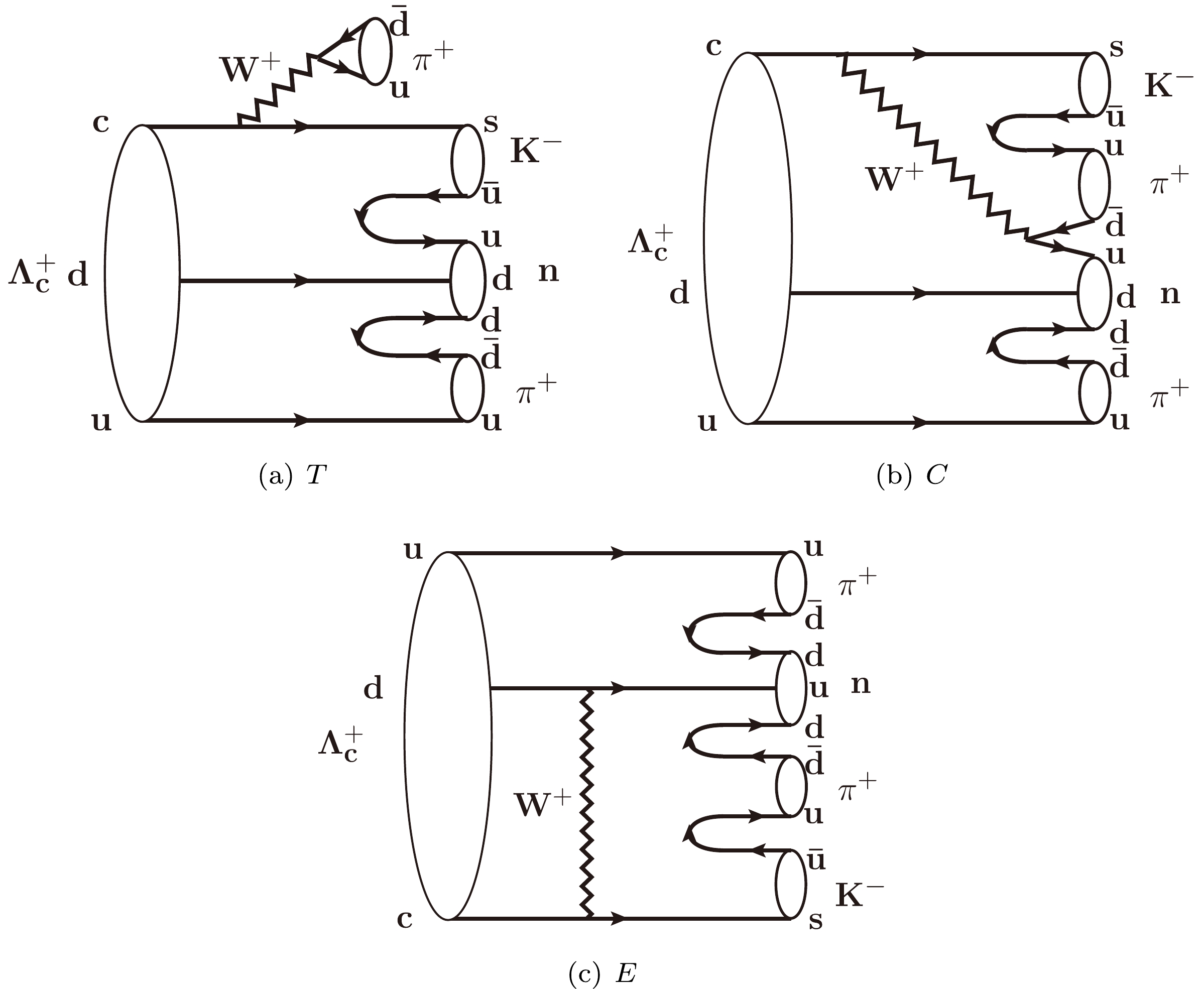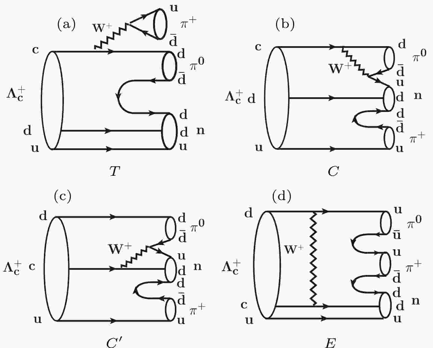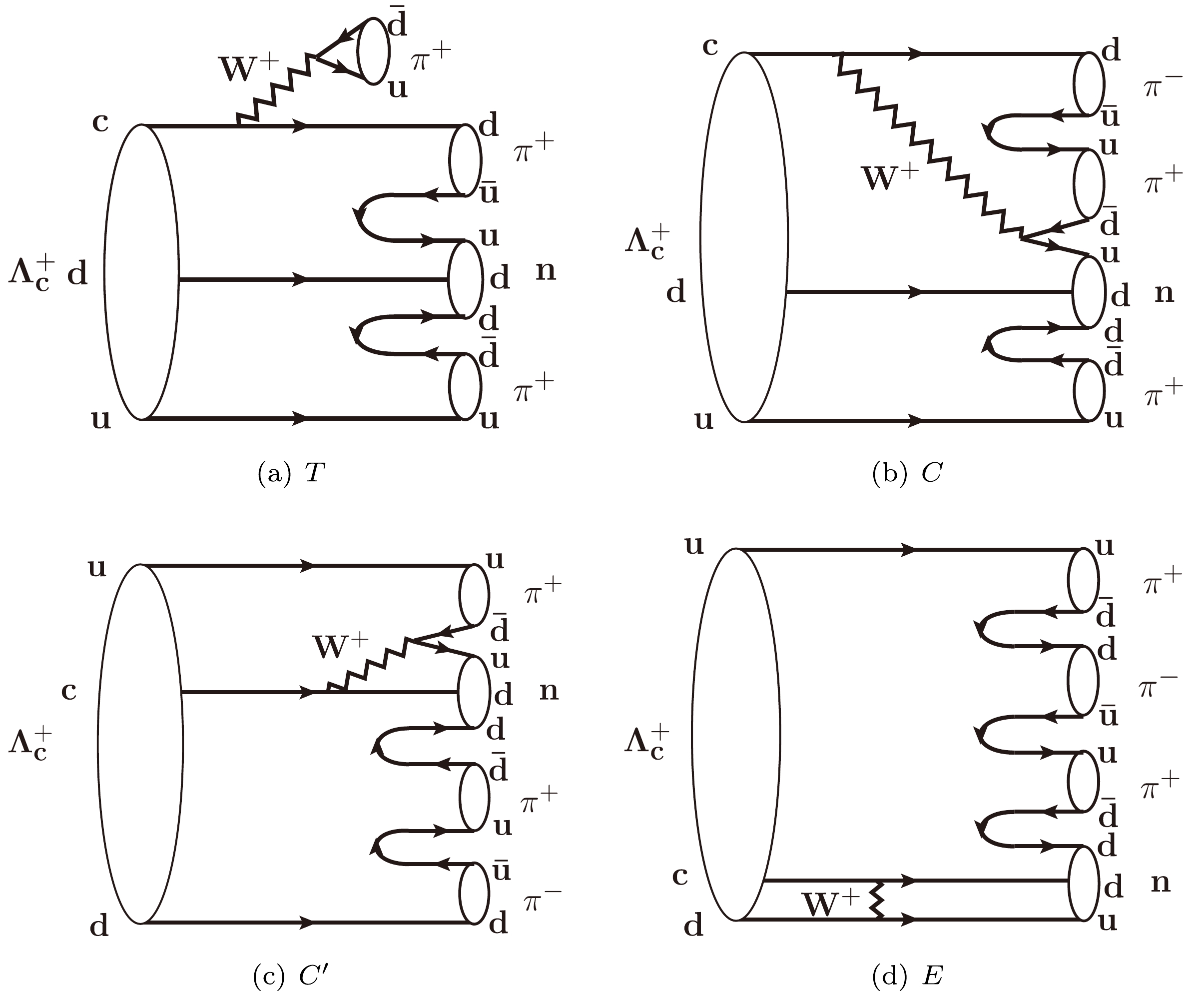 $ C^{\prime} $ and W-exchange amplitude E are introduced in the representation of these diagrams. In this scheme, one amplitude can be factorized into two parts, the decay constant of the emitted meson and the heavy-to-light transition form factor, which can be directly calculated. By way of example, the topological diagrams for$ \Lambda_{c}^{+}\to n\pi^{+}\pi^{0} $ can be seen in Fig. 1. We know that here the non-factorizable contribution is essential for understanding the weak decays of charmed baryons, in contrast to the negligible effect they contribute in heavy-meson decays [2]. Hence, studies of charmed baryon decays involving non-factorizable components are critical for understanding the underlying dynamics of charmed-baryon decays in general.