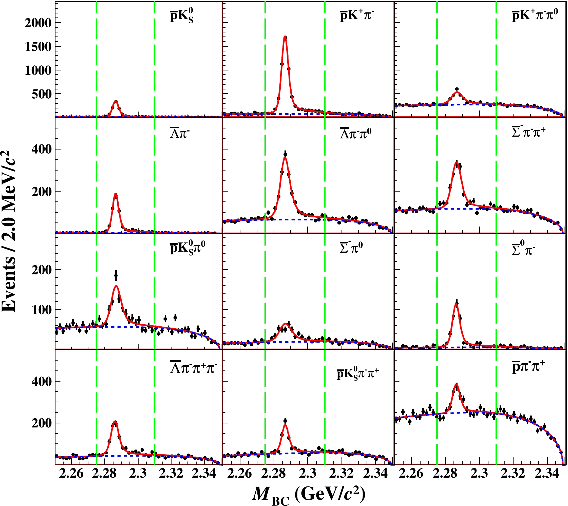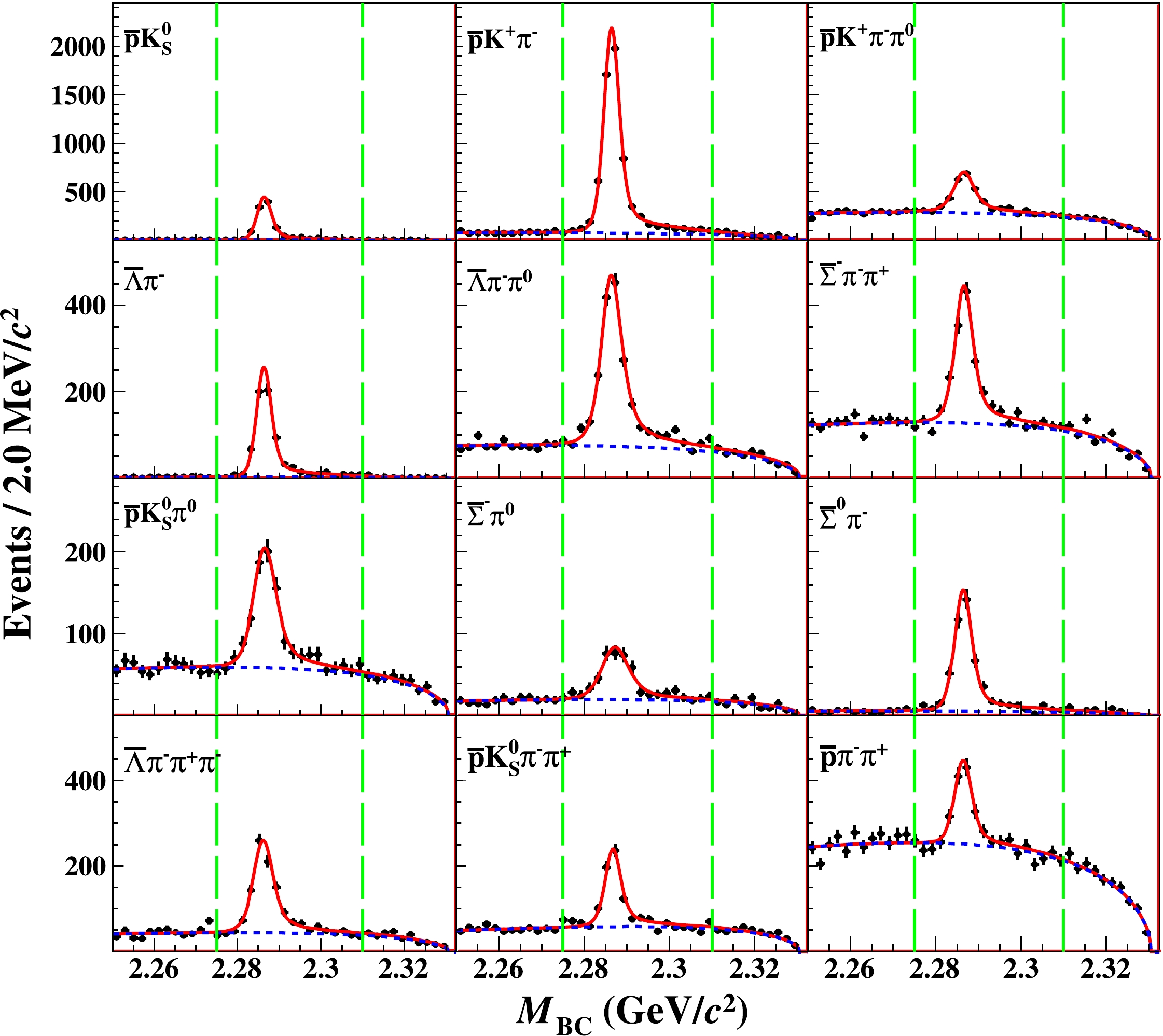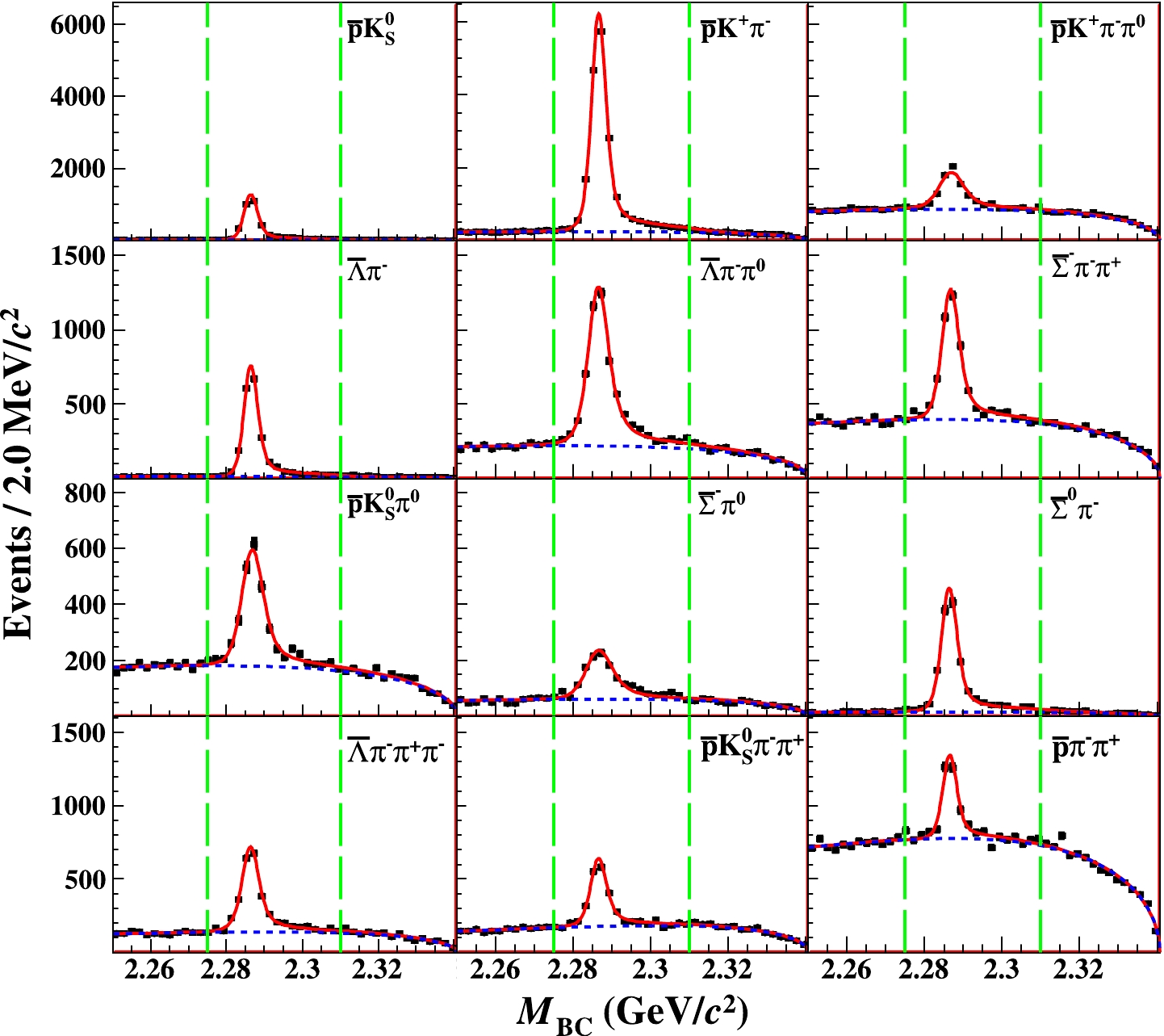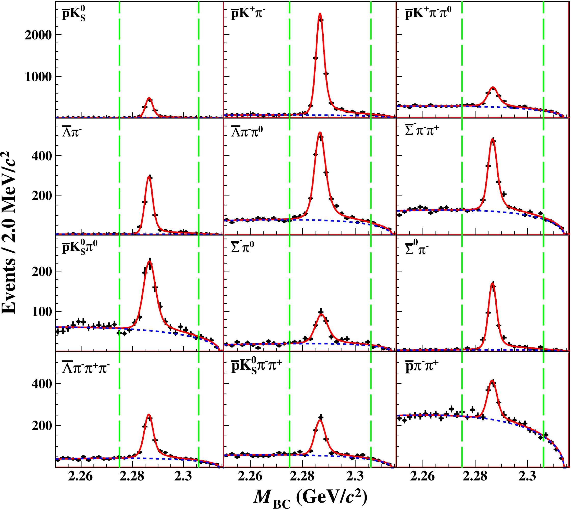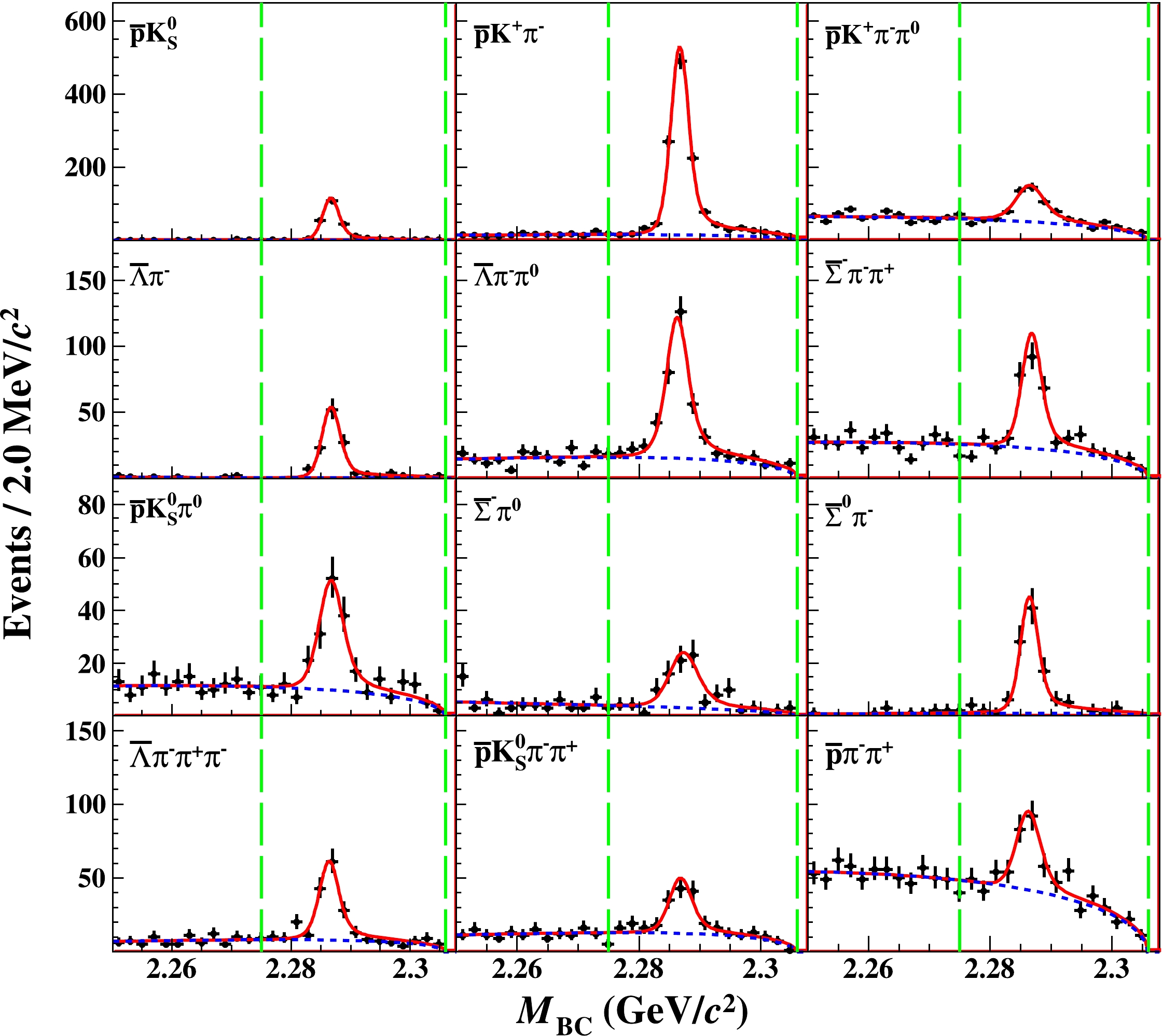 $ \bar{\Lambda}^{-}_{c} $ baryons are reconstructed with twelve exclusive hadronic decay modes, as listed in Table 2. This data set is referred to as the single-tag (ST) sample. The$ \pi^0 $ ,$ K_{S}^{0} $ ,$ \bar{\Lambda} $ ,$ \bar{\Sigma}^0 $ , and$ \bar{\Sigma}^- $ particles are reconstructed via individual dominant decay modes. Those events in which any of the signal decays$ \Lambda_c^+\to n \pi^+\pi^0 $ ,$ \Lambda_{c}^{+}\to n\pi^{+}\pi^{-}\pi^{+} $ , and$ \Lambda_{c}^{+}\to nK^{-}\pi^{+}\pi^{+} $ are reconstructed in the system recoiling against the ST$ \bar{\Lambda}_{c}^{-} $ candidates are denoted as DT candidates.Tag mode $ \Delta{}E $