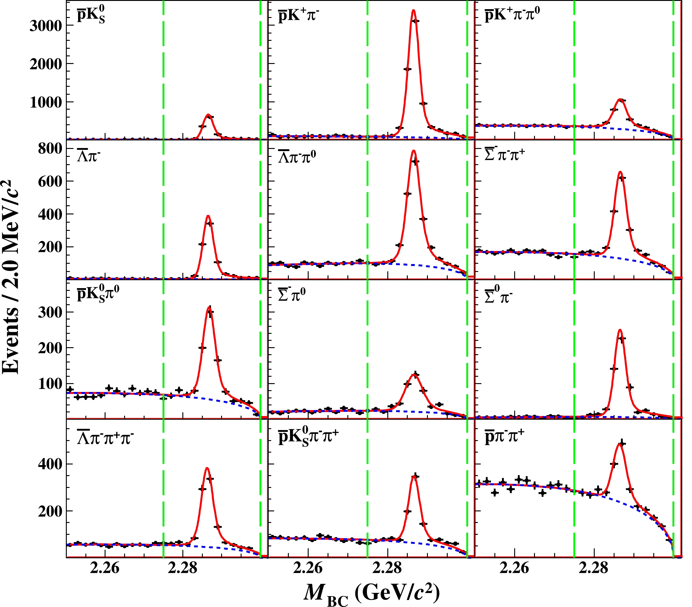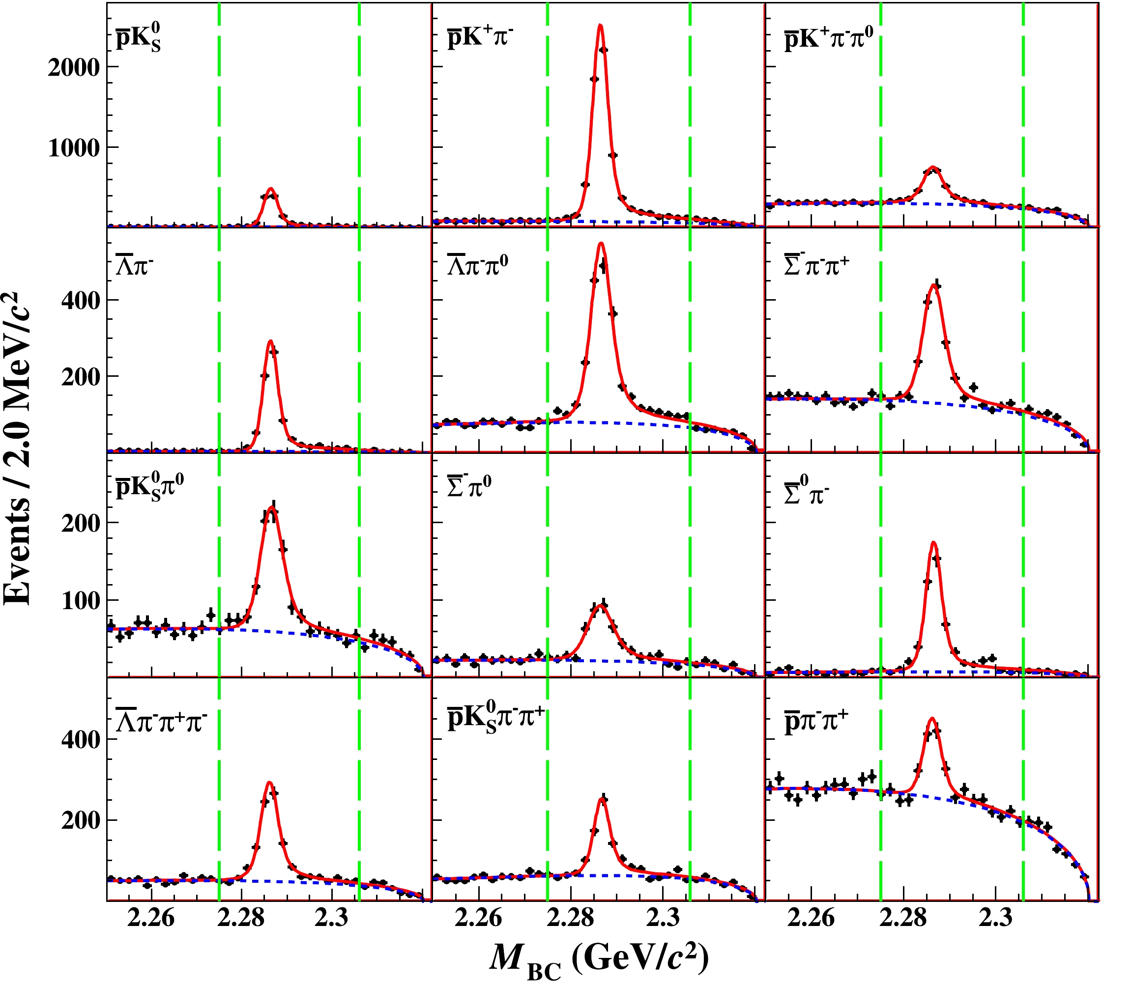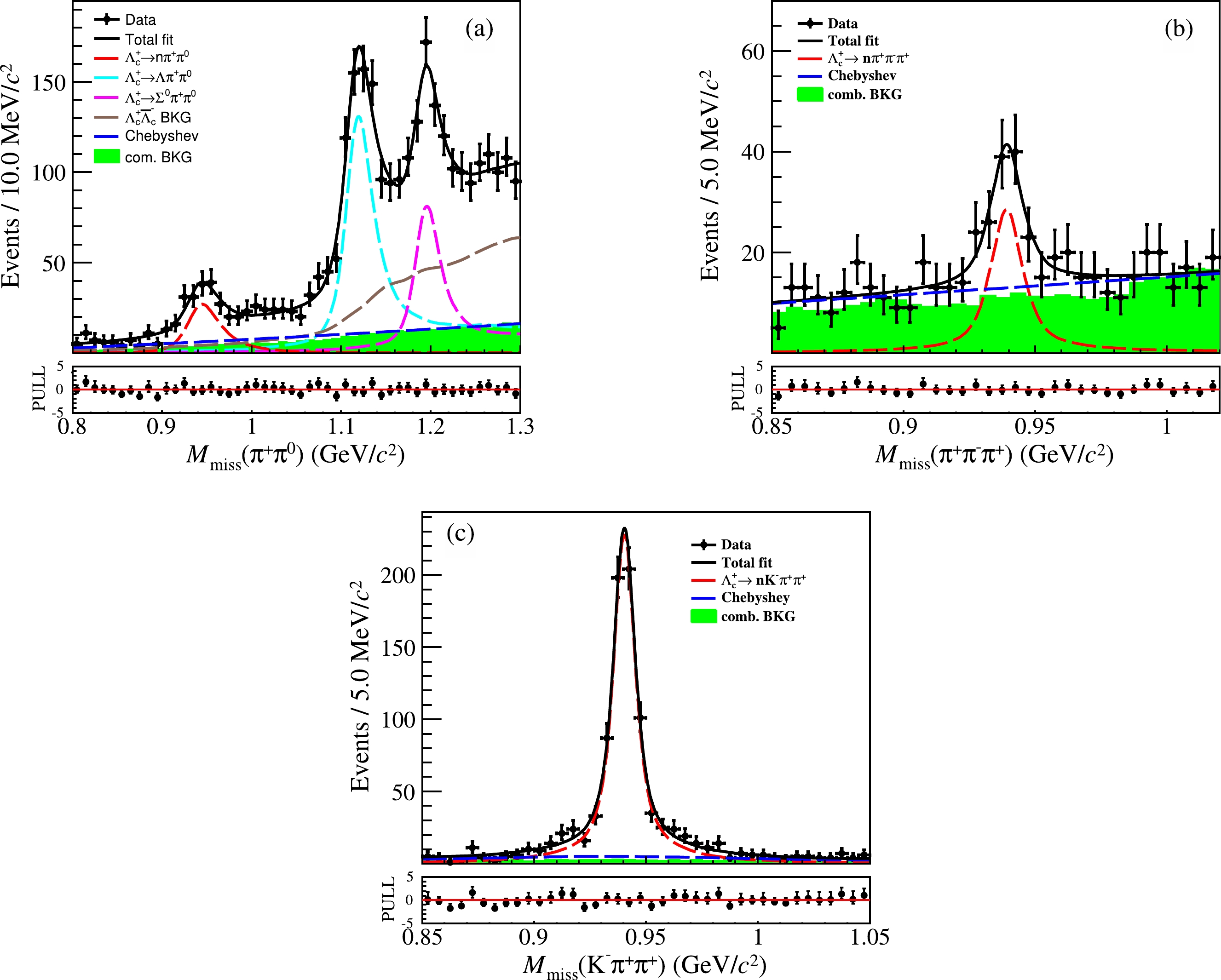 $ e^+e^- $ collisions provided by the BEPCII storage ring [33], which operates in the center-of-mass energy range from 2.0$ \,{\rm{GeV}} $ to 4.95$ \,{\rm{GeV}} $ . BESIII has collected large data samples in this energy region [34]. The cylindrical core of the BESIII detector covers 93% of the full solid angle and consists of a helium-based multilayer drift chamber (MDC), a plastic scintillator time-of-flight system (TOF), and a CsI(Tl) electromagnetic calorimeter (EMC), which are all enclosed in a superconducting solenoidal magnet providing a 1.0 T magnetic field. The solenoid is supported by an octagonal flux-return yoke with resistive plate counter muon identification modules interleaved with steel. The charged-particle momentum resolution at$ 1\; \,{\rm{GeV}}/c $ is$0.5$ %, and the specific ionization energy loss (dE/dx) resolution is$ 6 $ % for electrons from Bhabha scattering. The EMC measures photon energies with a resolution of$ 2.5 $ % ($ 5 $ %) at$ 1~{\rm{GeV}} $ in the barrel (end-cap) region. The time resolution in the TOF barrel region is 68 ps, while that in the end-cap region is 60 ps [35–37]. High-statistics Monte Carlo (MC) simulation samples for the process$ e^{+}e^{-}\to {\rm{inclusive}} $ are produced with the KKMC generator [38] by incorporating the initial-state radiation (ISR) effects and the beam-energy spread. The inclusive MC simulation sample, which consists of$ \Lambda_c^{+}\bar{\Lambda}_c^{-} $ events,$ D_{(s)}^{(*)} $ production, ISR return to lower-mass ψ states, and continuum processes$ e^{+}e^{-}\rightarrow q\bar{q} $ ($ q=u,d,s $ ), is generated to determine the ST detection efficiencies and estimate the potential background. For this MC simulation sample, all the known decay modes of charmed hadrons and charmonia are modeled with evtgen [39, 40] using BFs taken from the PDG [23], and the remaining unknown decays are modeled with LUNDCHARM [41]. Furthermore, exclusive DT signal MC simulation events, where the$ \bar{\Lambda}_{c}^{-} $ decays into any of the tag modes and the$ \Lambda_{c}^{+} $ decays into any of the signal modes of$ n\pi^{+}\pi^{0} $ ,$ n\pi^{+}\pi^{-}\pi^{+} $ or$ nK^{-}\pi^{+}\pi^{+} $ , are used to determine the DT dectection efficiencies. The Born cross sections are taken into account when producing the MC simulation sample of$ \Lambda_c^{+}\bar{\Lambda}_c^{-} $ pairs. The$ \Lambda_{c}^{+}\to n\pi^{+}\pi^{0} $ and$ \Lambda_{c}^{+}\to n\pi^{+}\pi^{-}\pi^{+} $ signal MC samples are simulated evenly distributed in phase space since the angular distributions, momentum distributions and the two-body invariant mass distributions of the final state particles of the signal MC simulation samples are in good agreement with data with the current size of data set. For the signal MC simulation sample of$ \Lambda^+_c\to nK^{-}\pi^{+}\pi^{+} $ , the key kinematic distributions mentioned above have been reweighted to agree with those of data. All final tracks and photons are fed into a GEANT4-based [42, 43] detector simulation package, which includes the geometric description of the BESIII detector. -