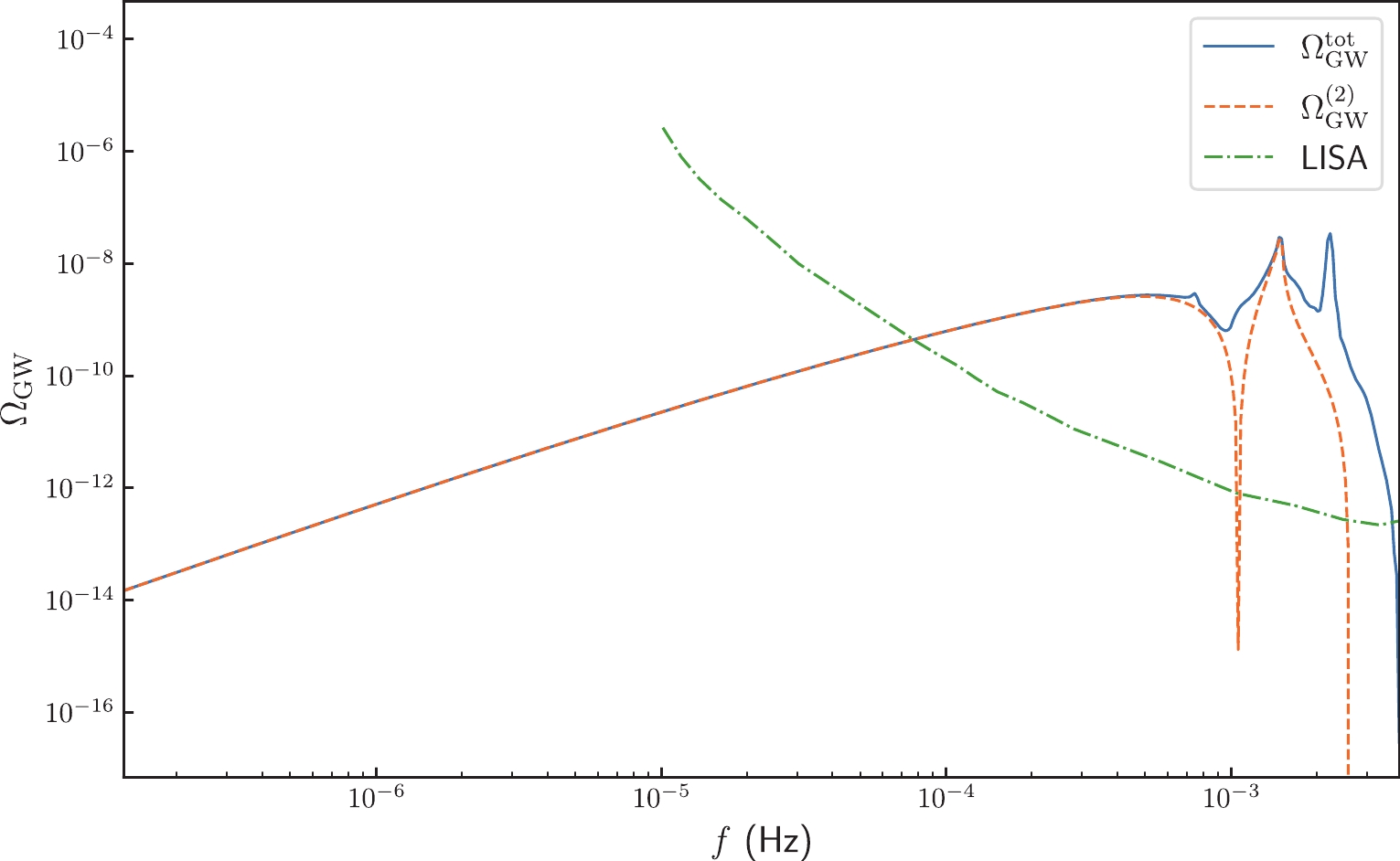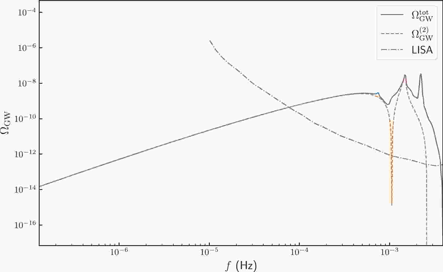 $\Omega^{(2)}_{\rm GW}$ (orange curve) and third order$\Omega^{\mathrm{tot}}_{\rm GW}= $ $ \Omega^{(2)}_{\rm GW}+ \Omega^{(3)}_{\rm GW}$ (blue curve) as functions of frequency f. We set$ f_*=1.3\times 10^{-3} $ Hz and$ A_{\zeta}=0.02 $ .To quantify the effects of third order SIGWs, we calculate the SNR ρ for LISA, which is given by [102–106]