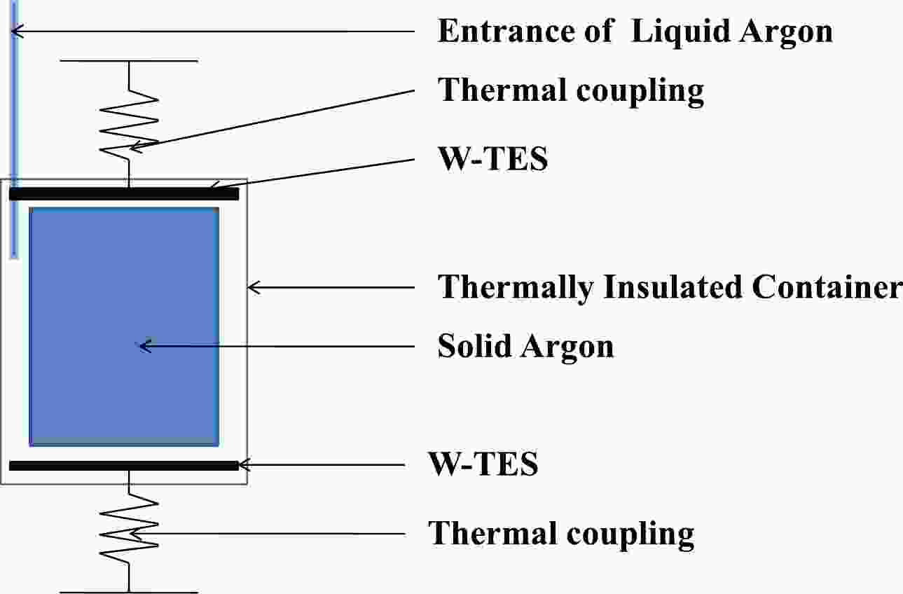 • In this section, we present a theoretical analysis of the anticipated performance of solid-argon phonon detectors. Based on the fundamental structure of CRESST's phonon scintillation detector [13], a novel cylindrical solid-argon phonon detector model is constructed as shown in Fig. 1. The model is constructed with dimensions of $ 3.44 $ cm in height and $ 3.44 $ cm in diameter, with a detector absorber mass of $ 32 $ g, and it utilizes tungsten transition edge sensors (W-TES) as temperature sensors. The density of solid argon at temperatures approaching $ 0 $ K is approximately 1.78 g/cm3 [14].
