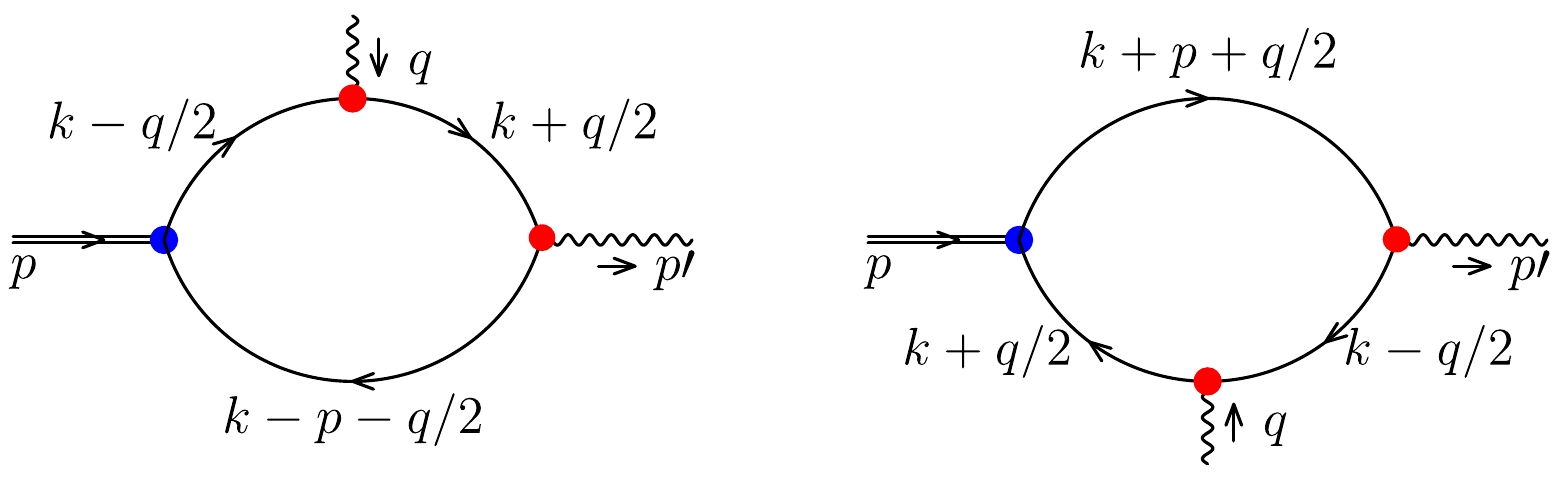 $ \pi^+ $ photon TDAs. The double lines represent$ \pi^+ $ , the single line corresponds to the quark propagator, the wavy line corresponds to the photon, the blue dot represents the$ \bar{q}q $ interaction kernel, the red dots represent the quark photon vertex. The left panel represents a quark u changed into a quark d by the bilocal current, the right panel represents a quark d changed into a quark u.$ p^2=m_{\pi}^2,\quad p^{\prime 2}=0, \quad q^2=\Delta^2=(p'-p)^2=t,$
