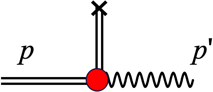 Figure 2. (color online) Pion pole contribution between the axial current (the cross) and the incoming pion-photon vertex, the double line represent the pion, the wavy line corresponds to the photon, the red dot represents the pion-photon vertex.