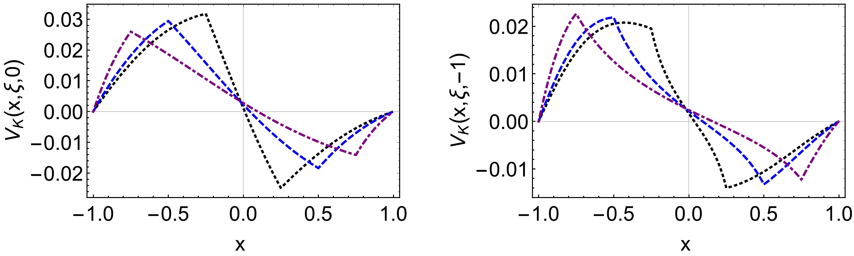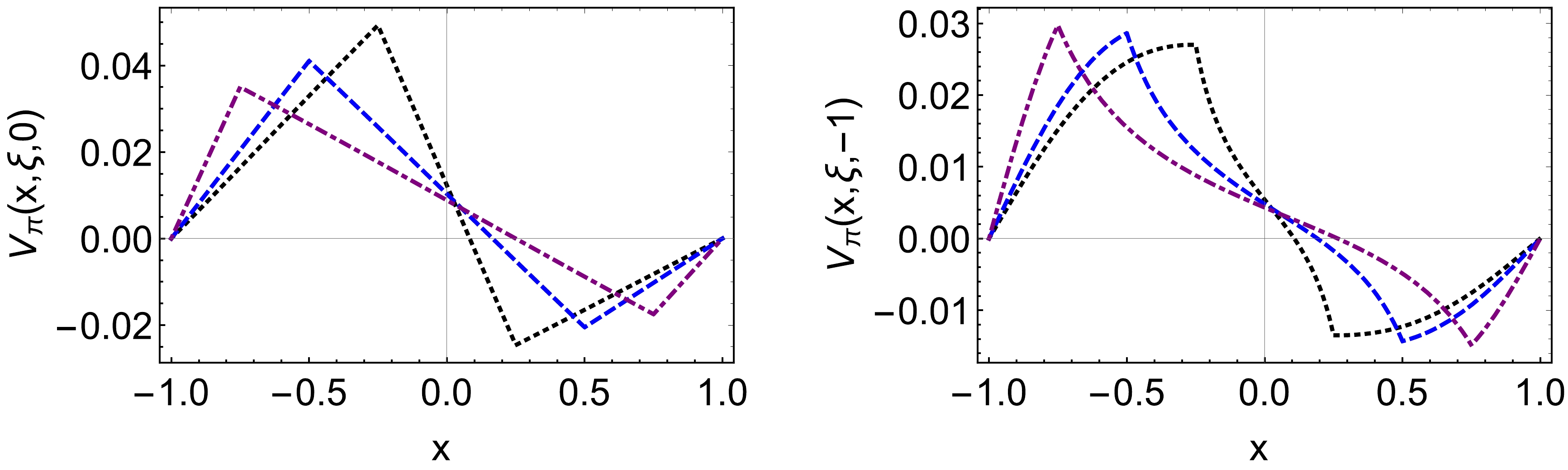 $ V^{\pi^+}(x,\xi,0) $ , right panel:$ V^{\pi^+}(x,\xi,-1) $ ):$ \xi=0.25 $ – black dotted curve,$ \xi=0.5 $ – blue dashed curve,$ \xi=0.75 $ – purple dotdashed curve.