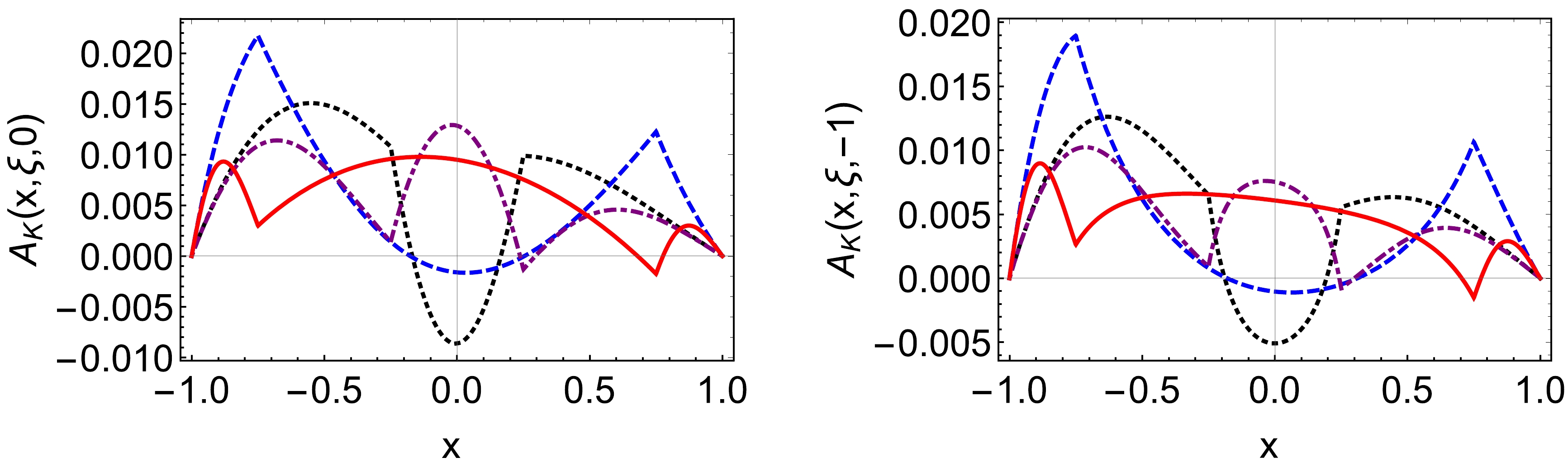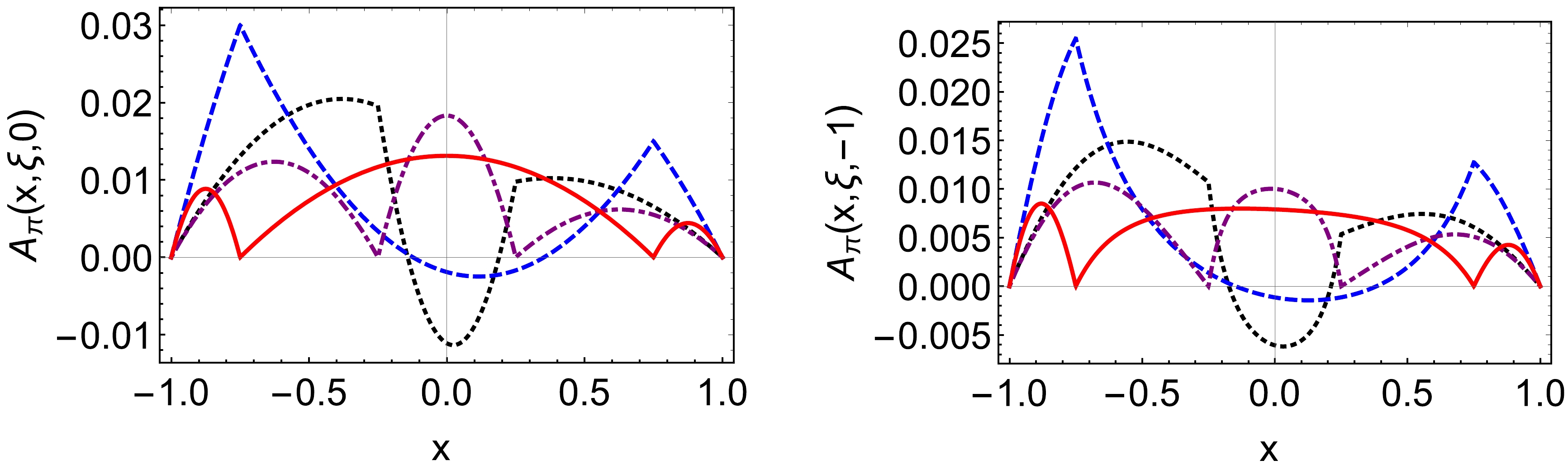 $ A^{\pi^+}(x,\xi,0) $ , right panel:$ A^{\pi^+}(x,\xi,-1) $ ):$ \xi=0.25 $ – black dotted curve,$ \xi=0.75 $ – blue dashed curve,$ \xi=-0.25 $ – purple dotdashed curve,$ \xi=-0.75 $ – red solid curve.$ V(x,\xi,t) = -\frac{1}{2}V(-x,\xi,t)\,, $