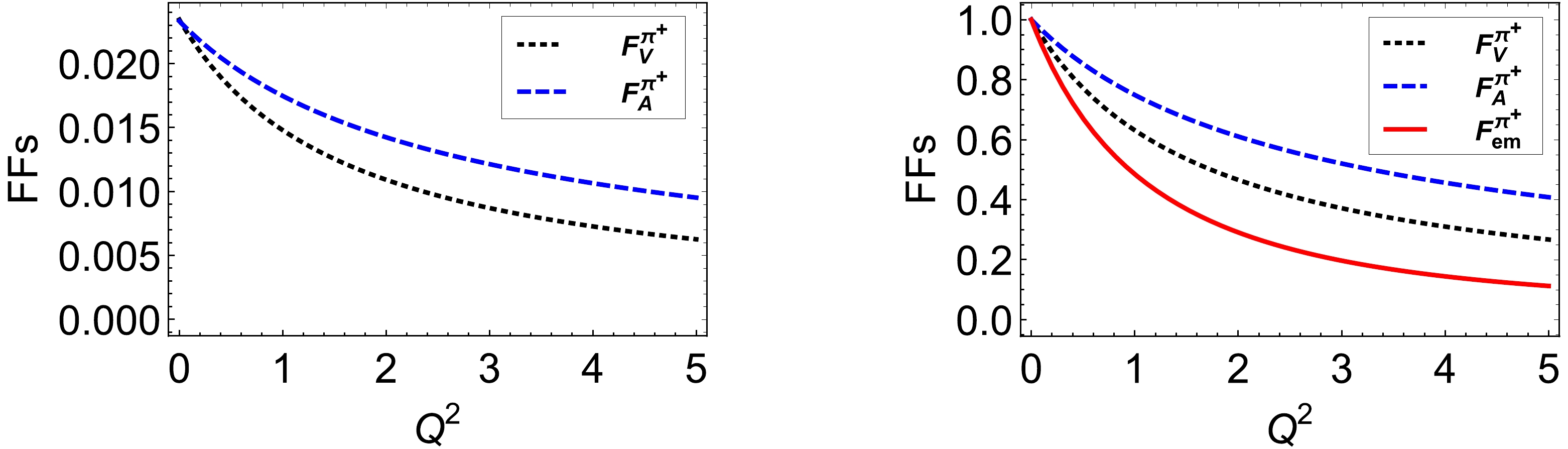 $ F_V^{\pi^+}(Q^2) $ – dotted black curve; axial FF$ F_A^{\pi^+}(Q^2) $ – dashed black curve; right panel:$ F_V^{\pi^+}(Q^2)/F_V^{\pi^+}(0) $ – dotted black curve;$ F_A^{\pi^+}(Q^2)/F_A^{\pi^+}(0) $ – dashed black curve, electromagnetic FF$ F_{em}^{\pi^+}(Q^2)/F_{em}^{\pi^+}(0) $ – red solid curve. -