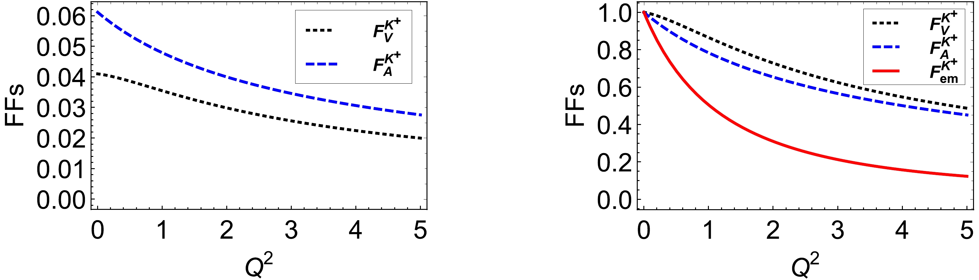$ F_V^{K^+}(Q^2) $ – dotted black curve; axial FF$ F_A^{K^+}(Q^2) $ – dashed black curve; right panel:$ F_V^{K^+}(Q^2)/F_V^{K^+}(0) $ – dotted black curve;$ F_A^{K^+}(Q^2)/F_A^{K^+}(0) $ – dashed black curve, electromagnetic FF$ F_{em}^{K^+}(Q^2)/F_{em}^{K^+}(0) $ – red solid curve. -