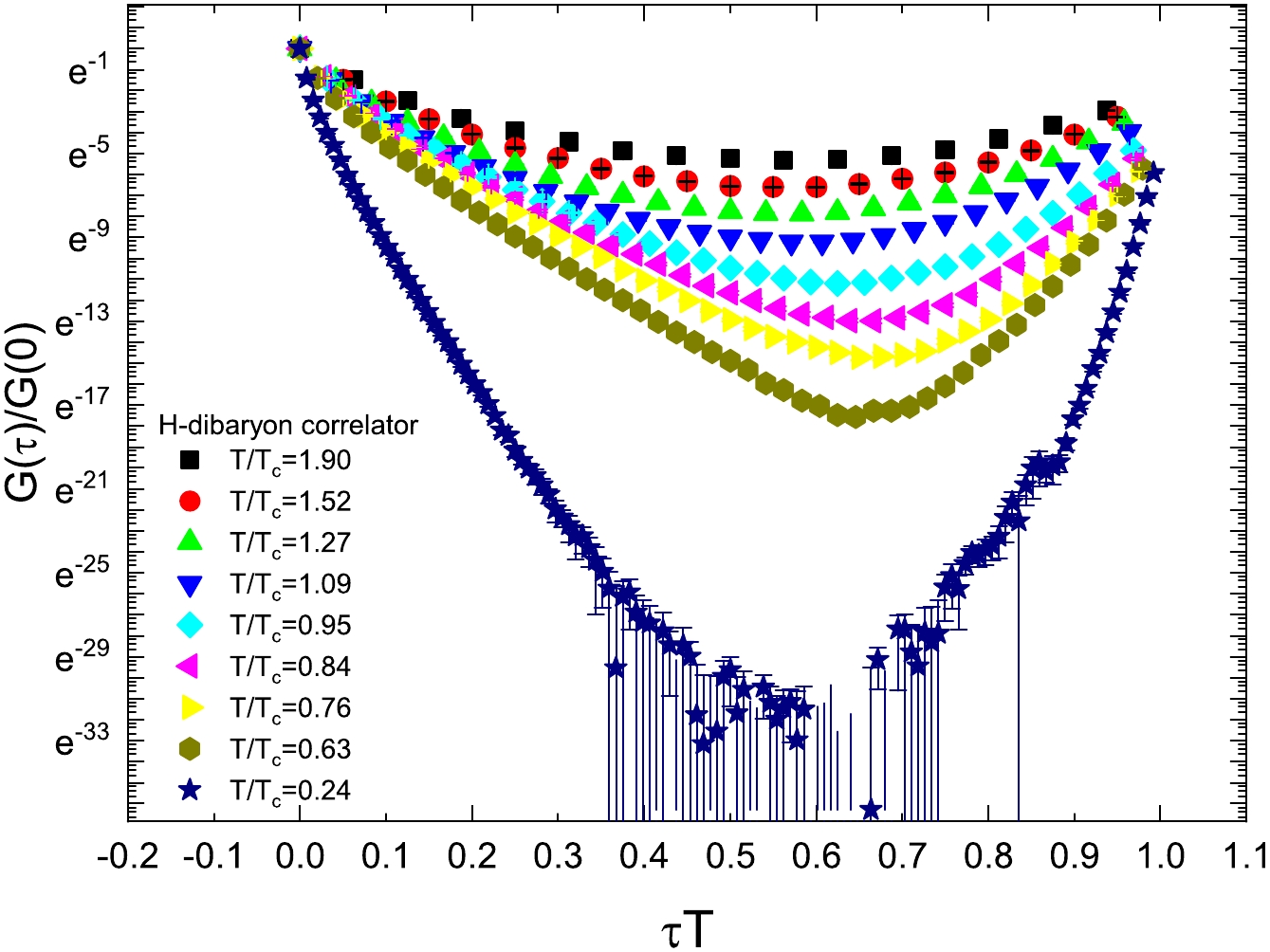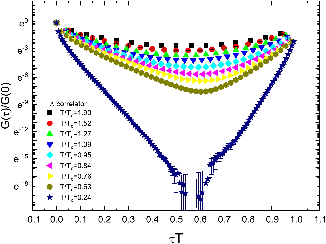 $ G(\tau)/G(0) $ of Λ as a function of$ \tau T $ at different temperatures. At the lowest temperature$ T/T_c =0.24 $ , the correlators at some points are not displayed because they take negative values.