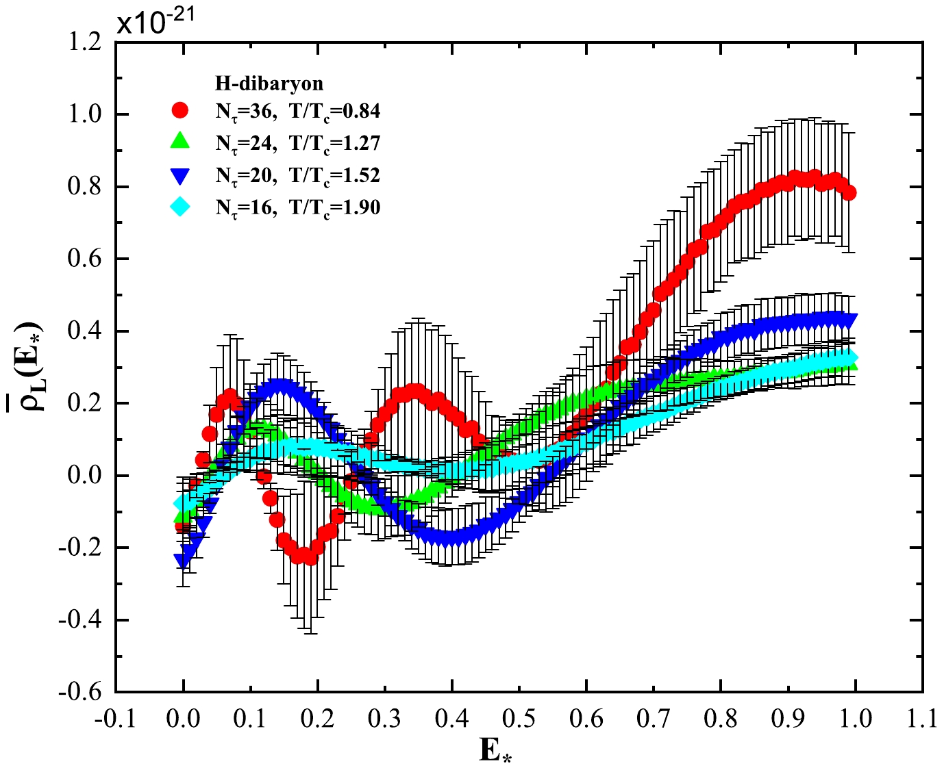 $ \bar\rho_L(E_\star) $ of the correlation function of N, Σ, Ξ, Λ, and H-dibaryon using a public computer program [72].We present the spectral density for