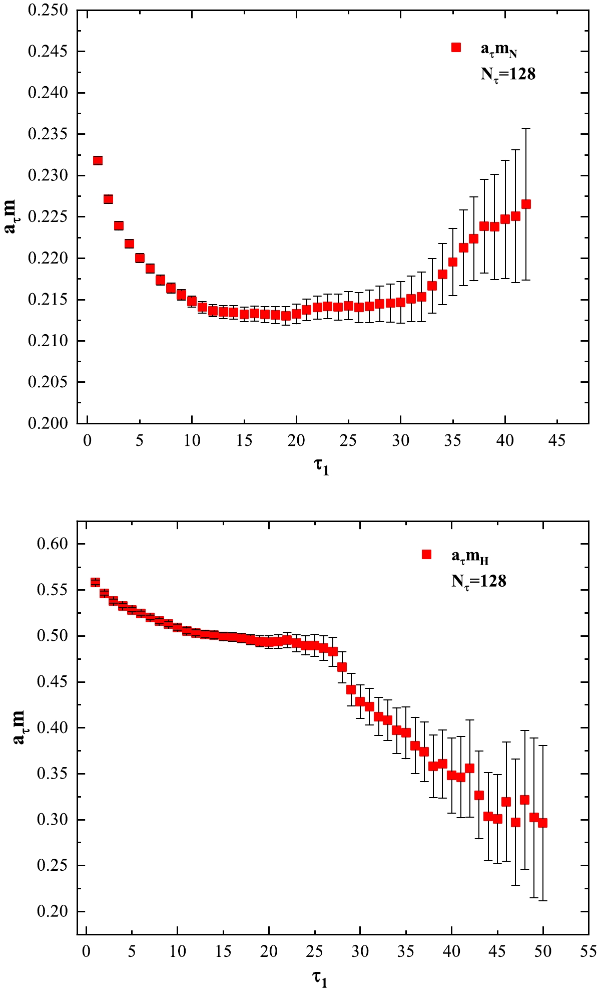 $ N_\tau=128 $ ensembles. The mass values are the fitting parameter$ m_+ $ in Eq. (5) extracted by the fitting procedure in different intervals$ [\tau_1, \tau_2] $ . The horizontal axis label$ \tau_1 $ represents different number of time slices suppressed corresponding to the lower bound of the interval$ [\tau_1, \tau_2] $ .