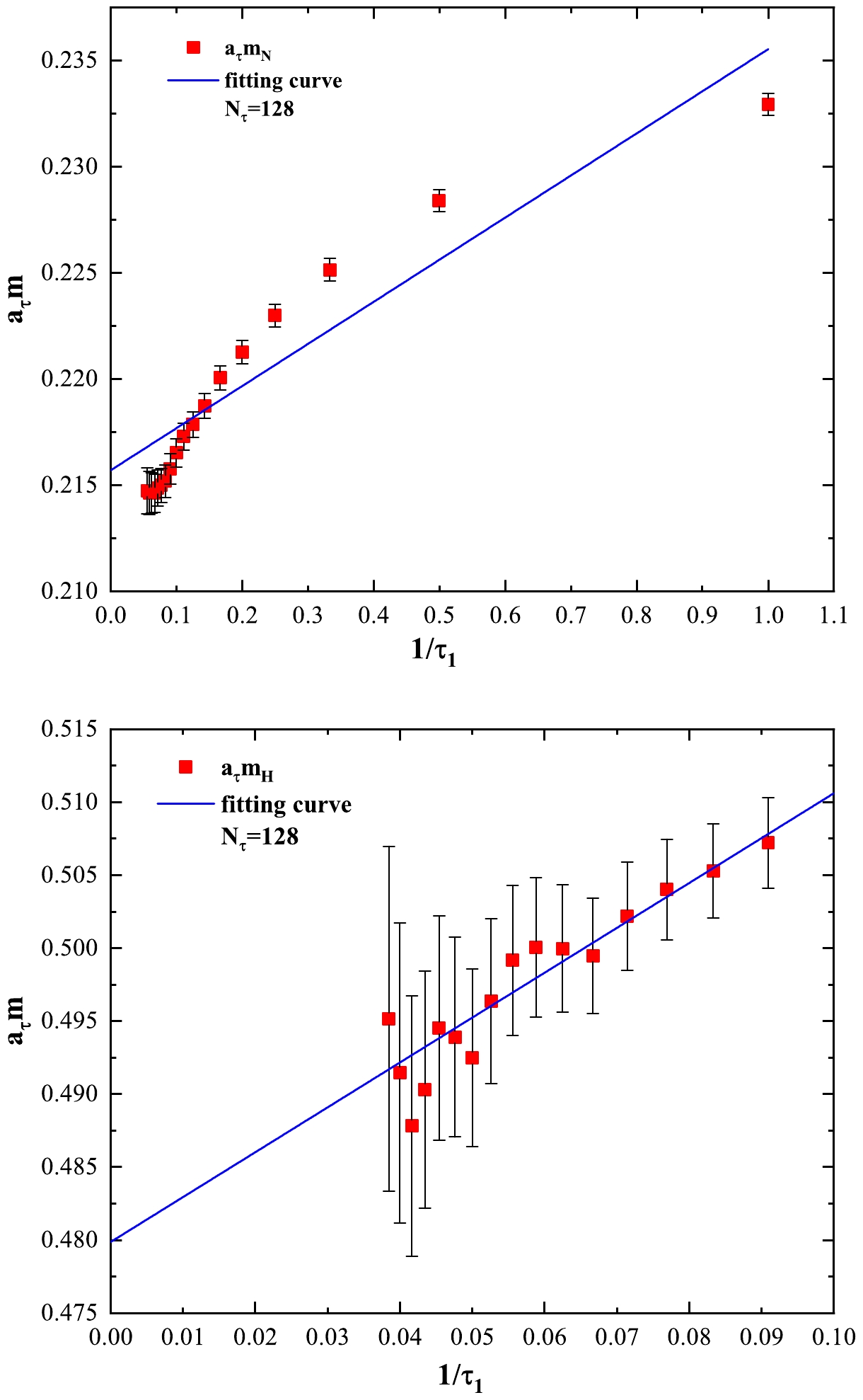 $ N_\tau=128 $ ensembles. The horizontal axis represents inverse values of time slices suppressed.The results are listed in Table 3. Note that the masses decrease when the temperature increases. We compare our results of N and Λ below