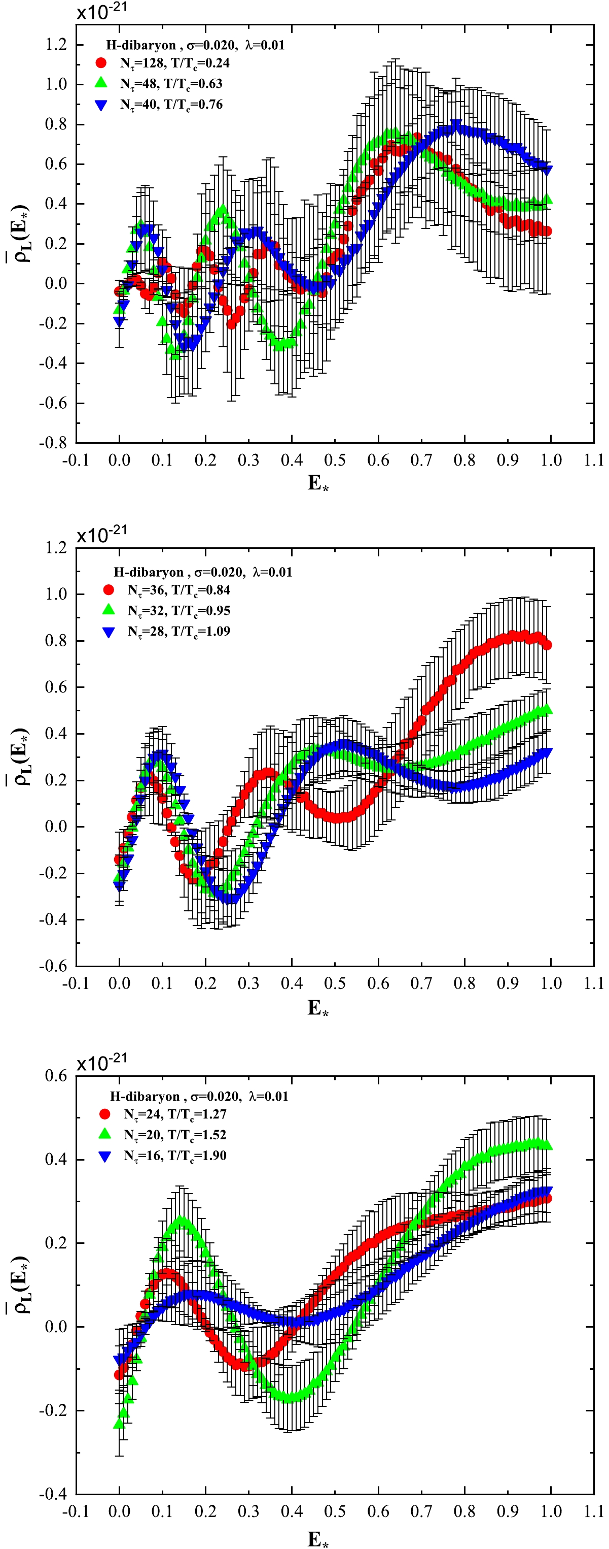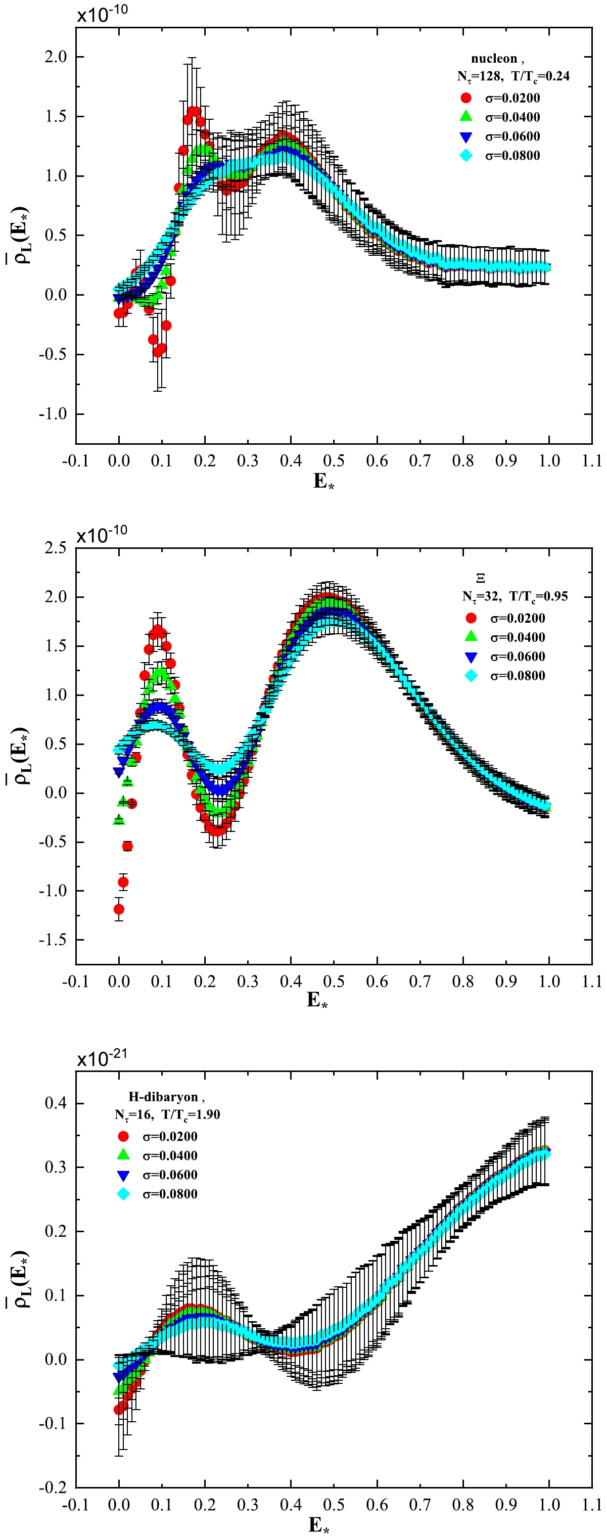 $ N_\tau $ lattices, peak position$ E_\star $ of the spectral density for H-dibaryon.The middle panel in Fig. 5 for Ξ at