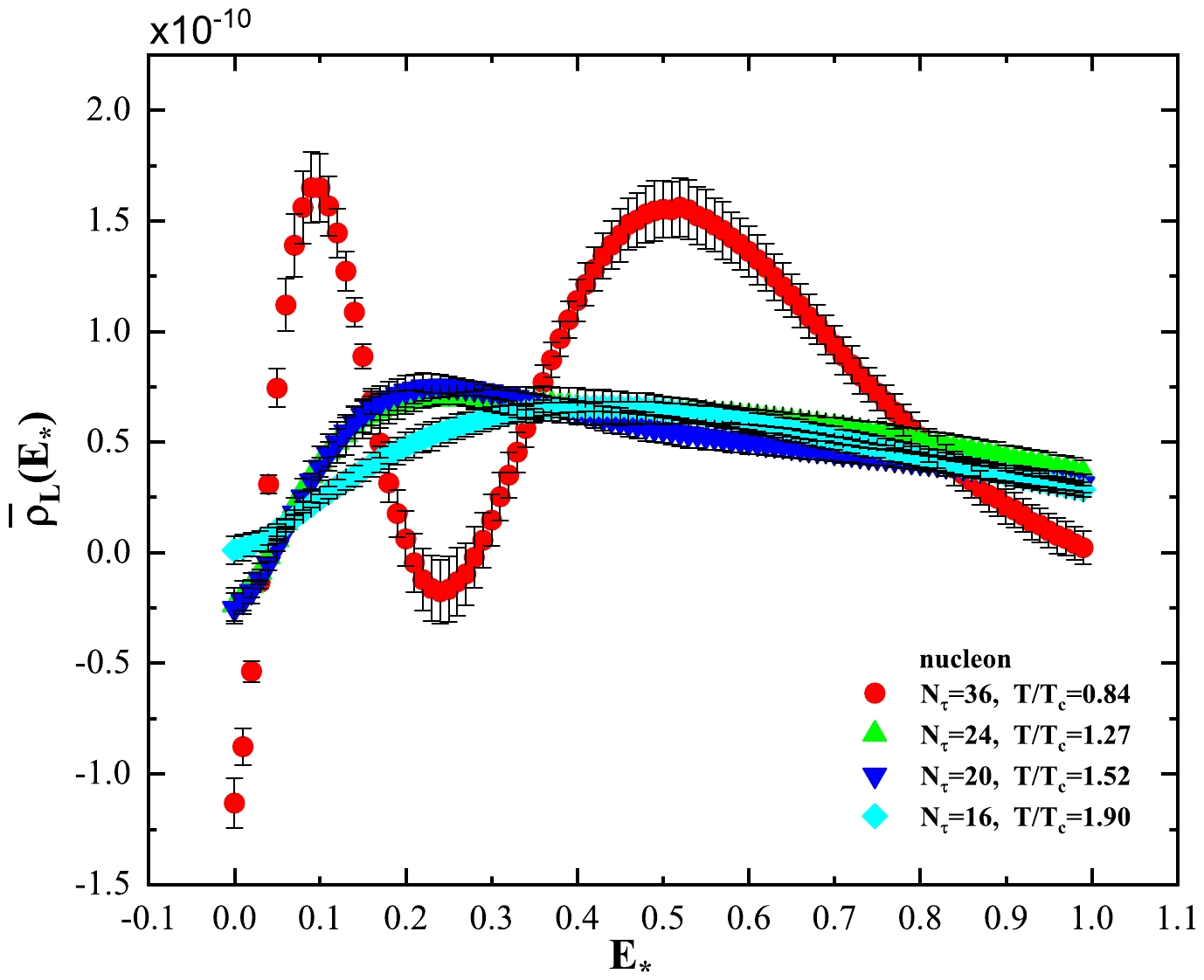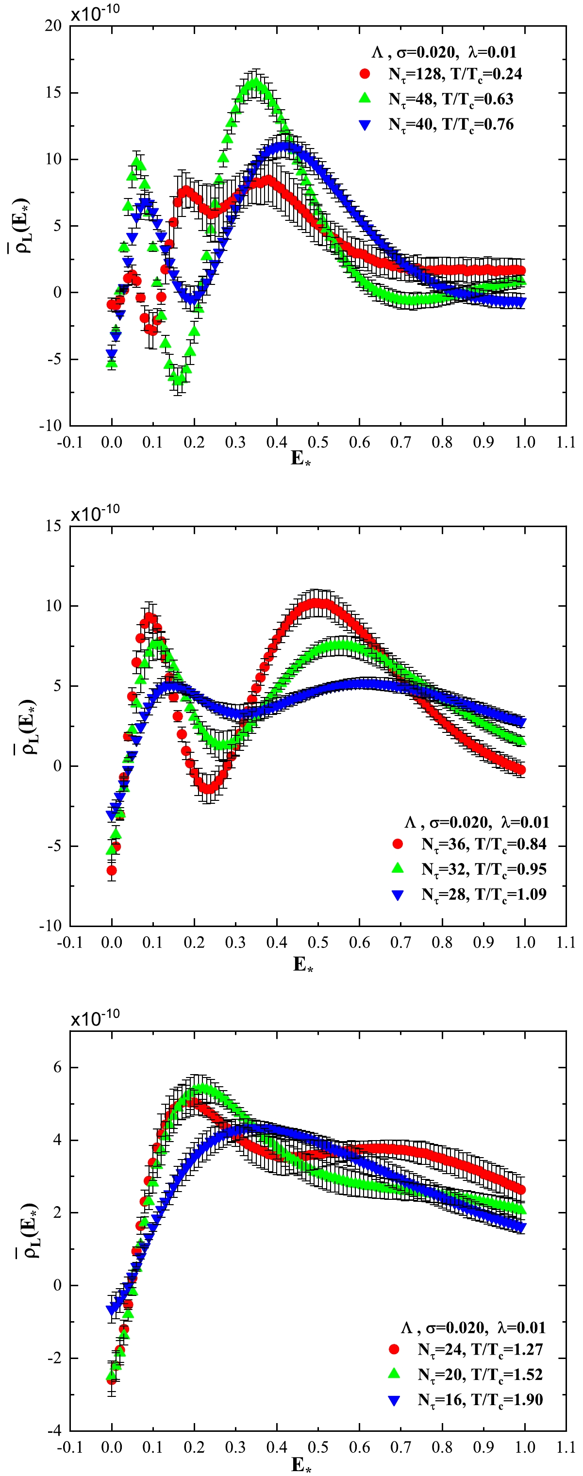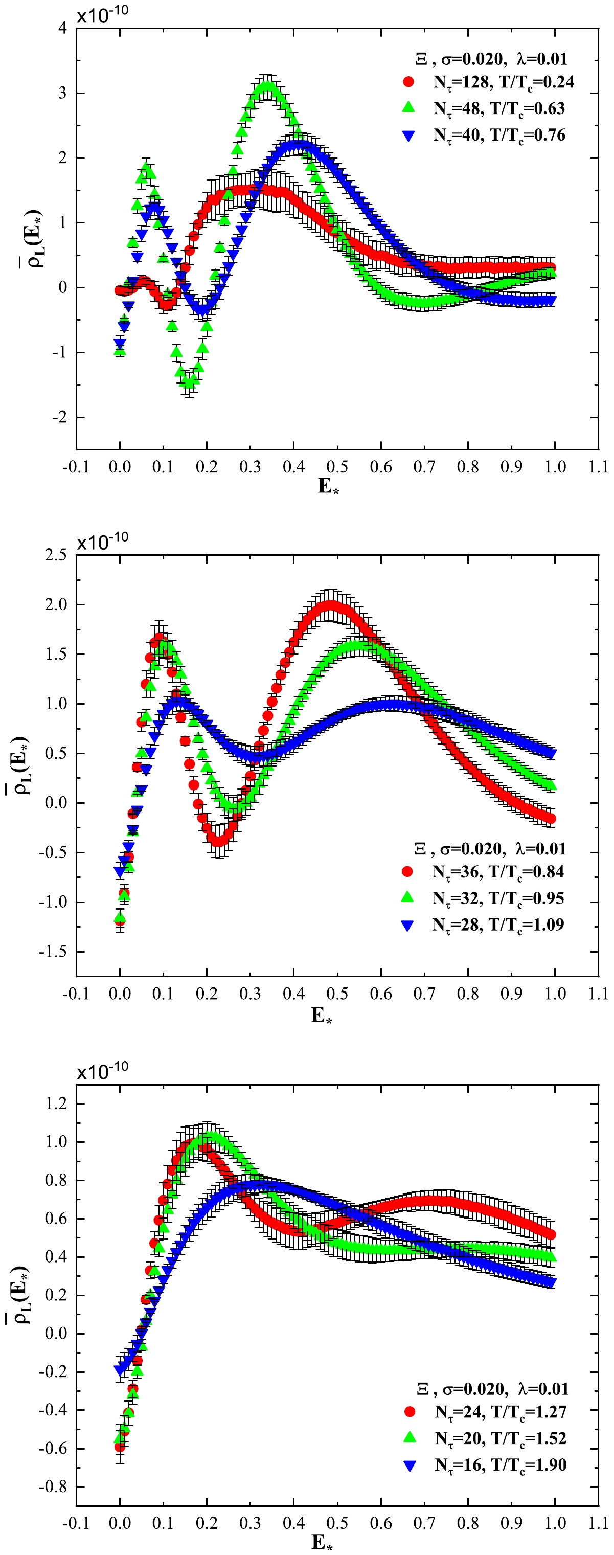 $ \bar\rho_L(E_\star) $ exhibits a two-peak structure. If we take the smaller values of$ E_\star $ at peak positions as the ground state energies of the corresponding particle, then these mass values obtained by the peak position of$ \bar\rho_L(E_\star) $ are smaller than those mass values obtained in Refs. [49] and [45]. The mass values of$ a_\tau m_\Xi $ ,$ a_\tau m_\Lambda $ , and$ a_\tau m_H $ presented in Table 3 are not consistent with the peak positions of the corresponding spectral density. Note that the mass values obtained by the extrapolation method are affected by the two-peak structure of the spectral density.At high temperatures, i.e.,