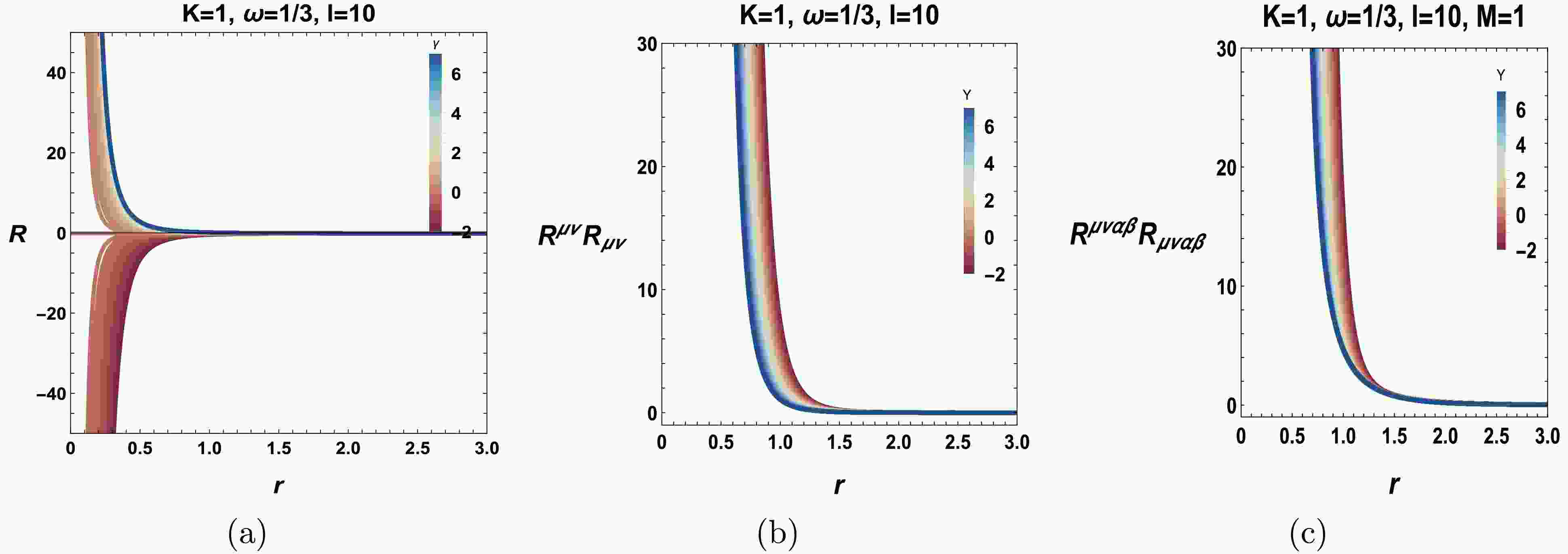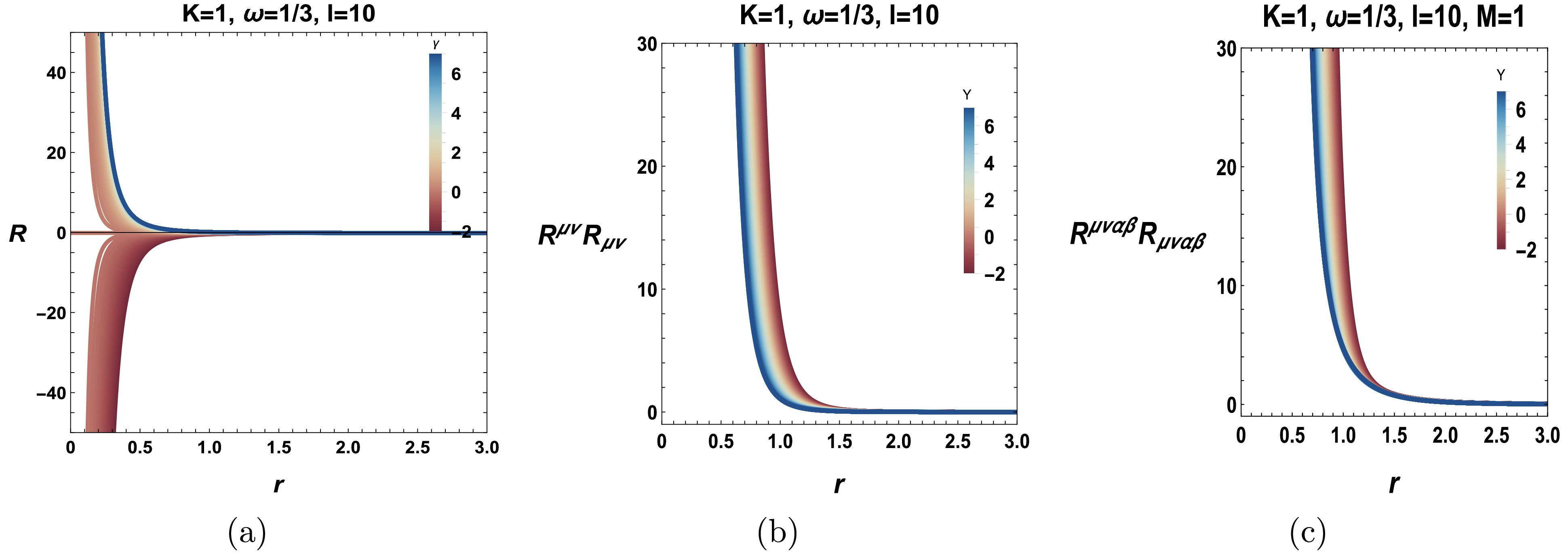 Figure 1. (color online) Ricci, Ricci squared, and Kretschmann scalars for various values of the black hole system.
