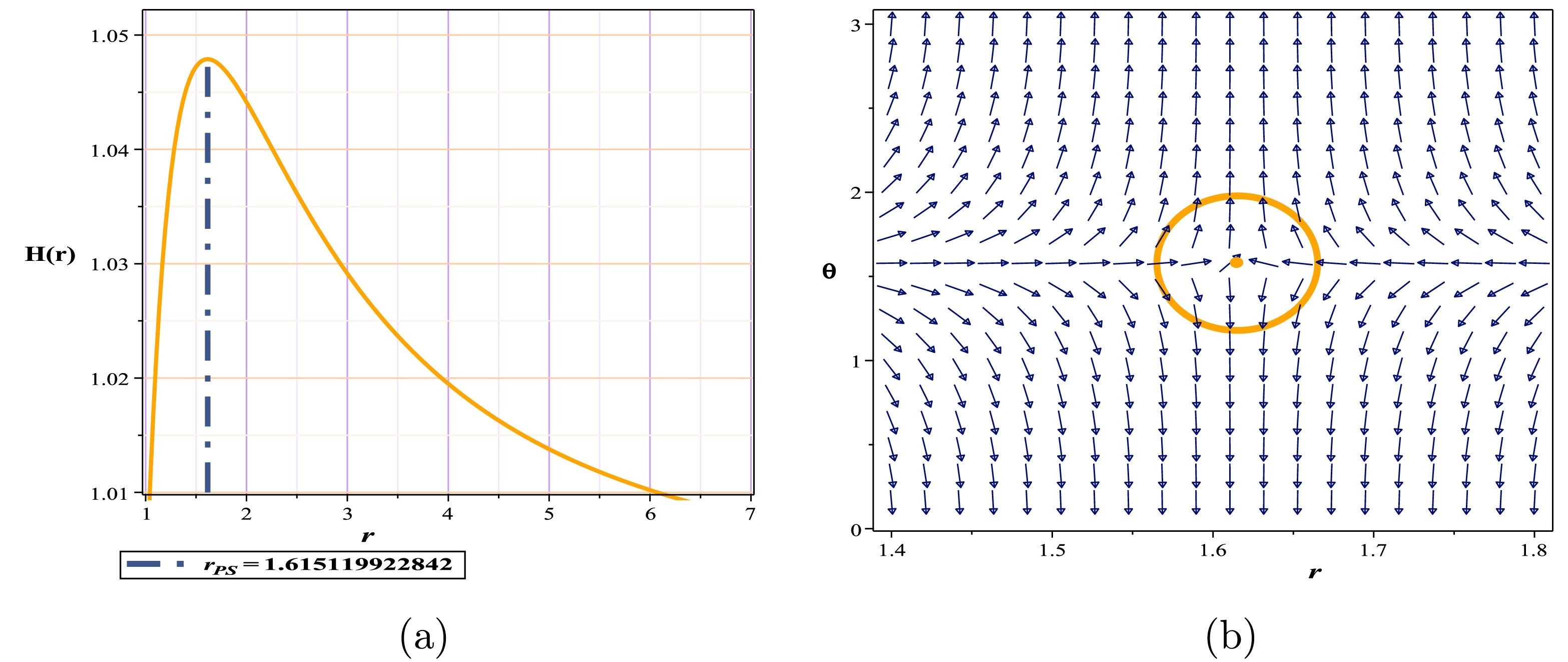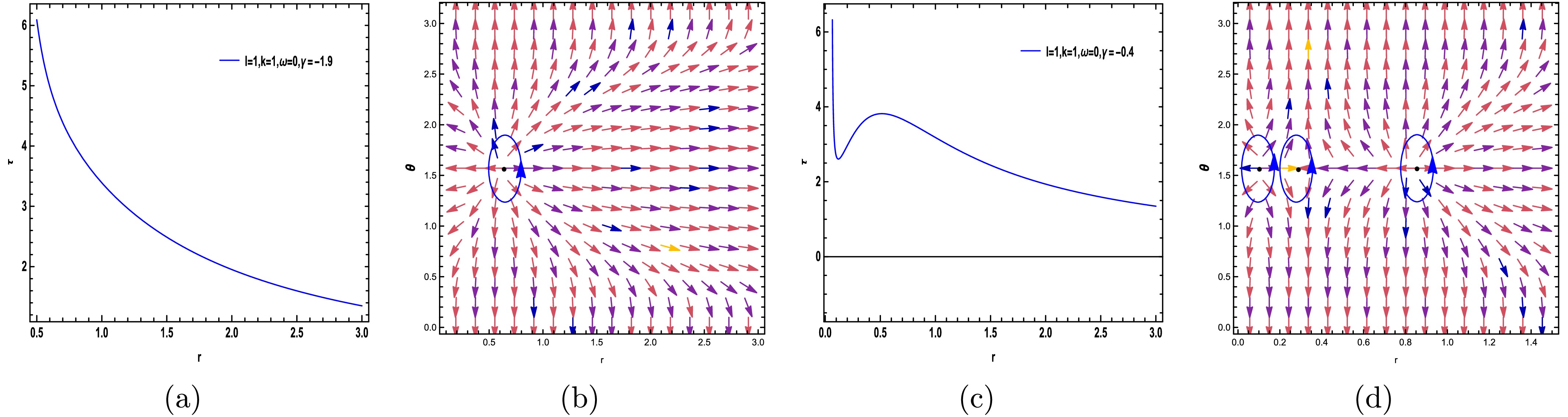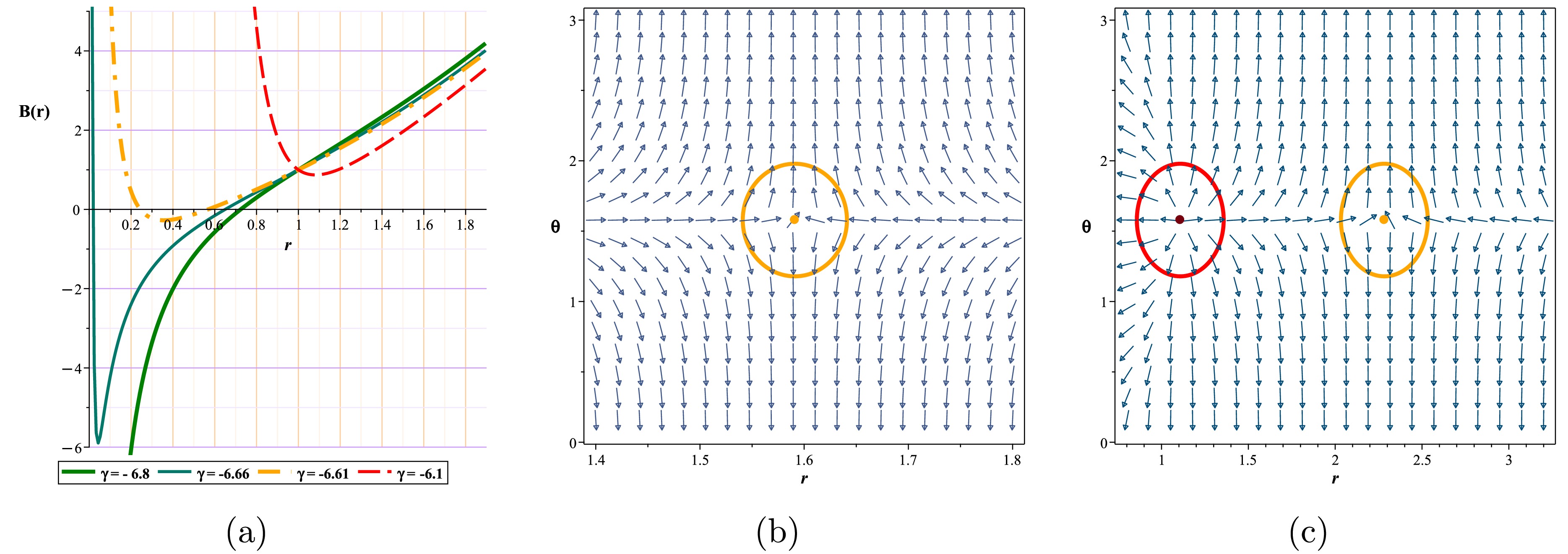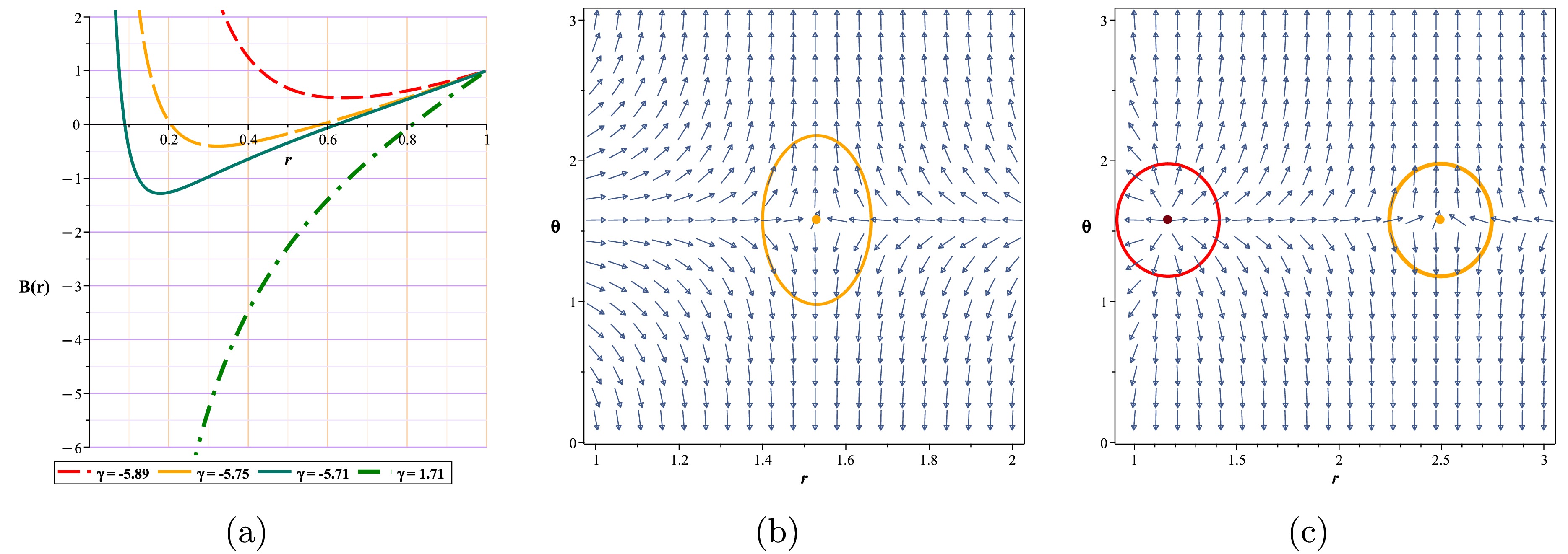 $ (r-\theta) $ plane. The photon sphere is located at$ (r,\theta)=(1.53024,1.57) $ with respect to$ (\gamma=-5.68, m=1,l=1,k=1) $ . (c) Normal vector field n in the$ (r-\theta) $ plane. The photon spheres are located at$ (r,\theta)=(1.164619828617,1.57),(r,\theta)=(2.495766445262,1.57) $ with respect to$ (\gamma=-6.1, m=1,l=1,k=1) $ .$ H =\frac{\sqrt{\dfrac{k \,r^{\frac{24 \pi +16 \gamma}{24 \pi +11 \gamma}} r +r^{3}+r -2}{r}}}{\sin \left(\theta \right) r}, $