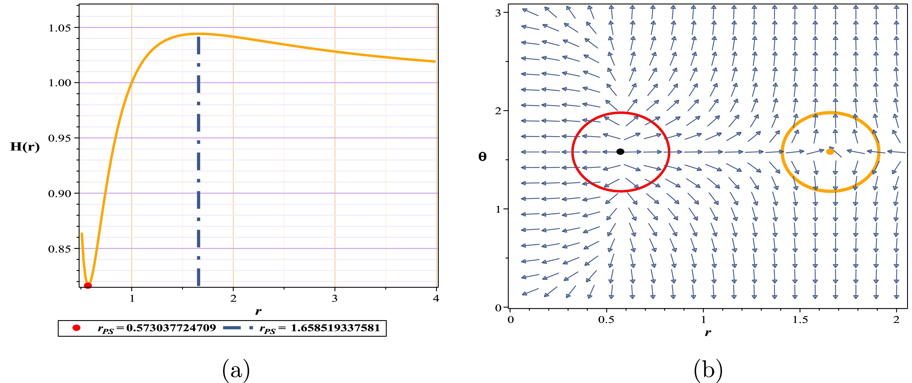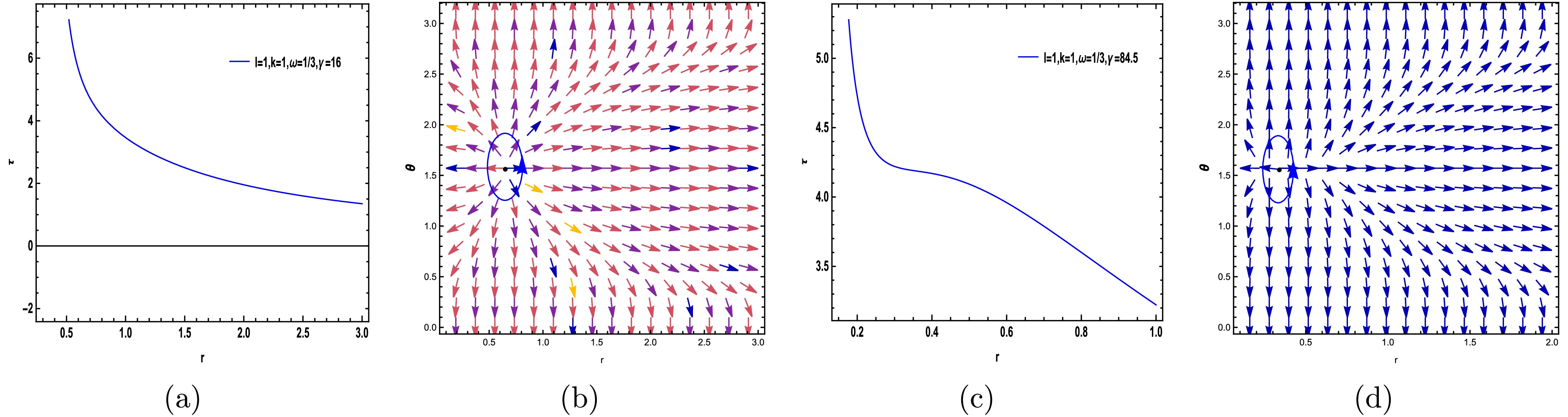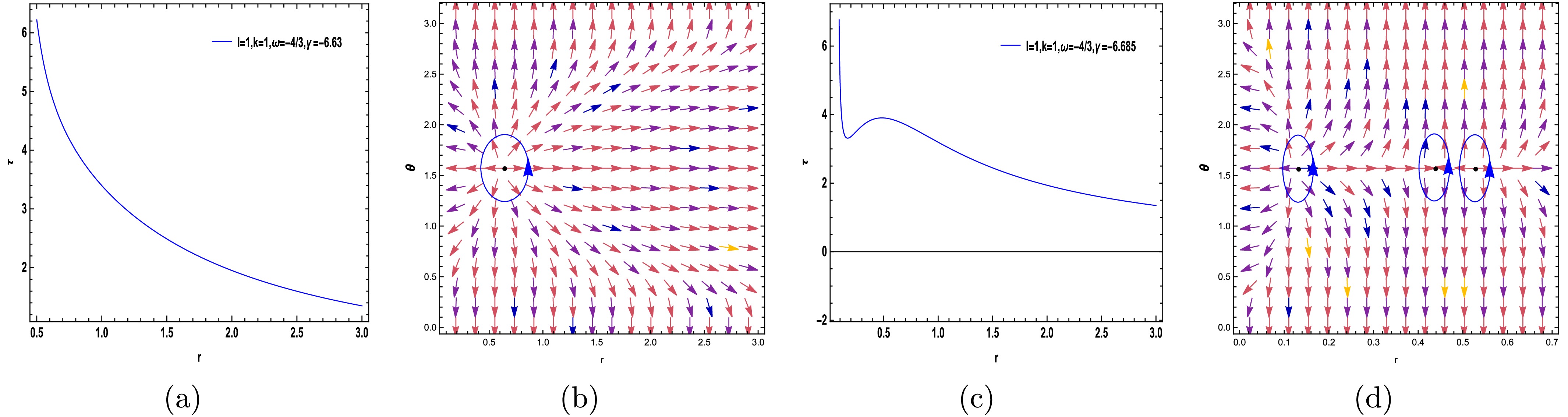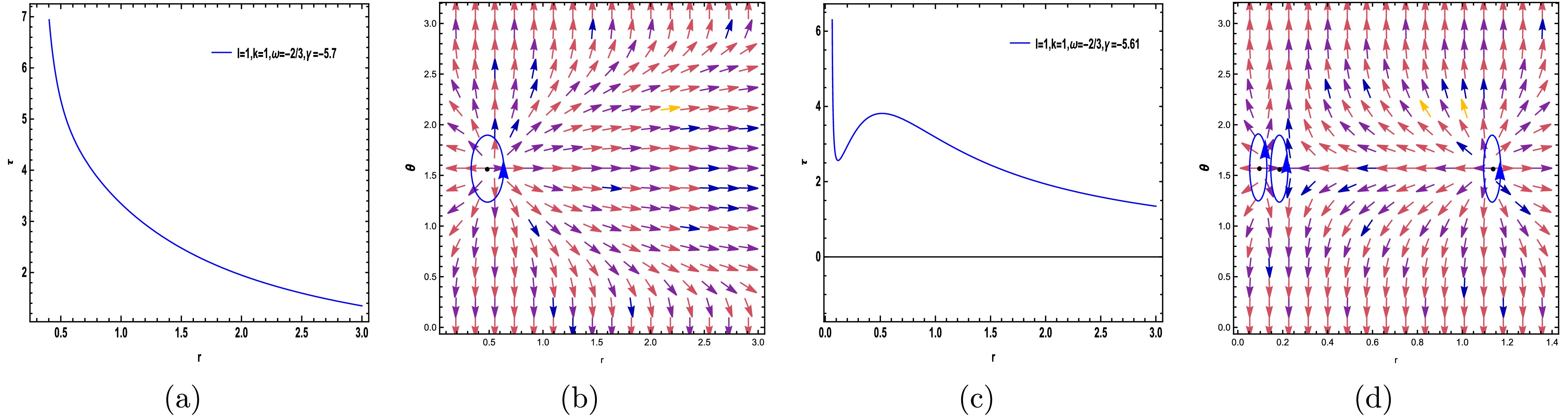 $ (r-\theta) $ plane. The photon sphere is located at$ (r,\theta)=(1.53024,1.57) $ with respect to$ (\gamma=-5.68, m=1,l=1,k=1) $ . (c) Normal vector field n in the$ (r-\theta) $ plane. The photon spheres are located at$ (r,\theta)=(1.164619828617,1.57),(r,\theta)=(2.495766445262,1.57) $ with respect to$ (\gamma=-6.1, m=1,l=1,k=1) $ .$ H =\frac{\sqrt{\dfrac{k \,r^{\frac{24 \pi +16 \gamma}{24 \pi +11 \gamma}} r +r^{3}+r -2}{r}}}{\sin \left(\theta \right) r}, $