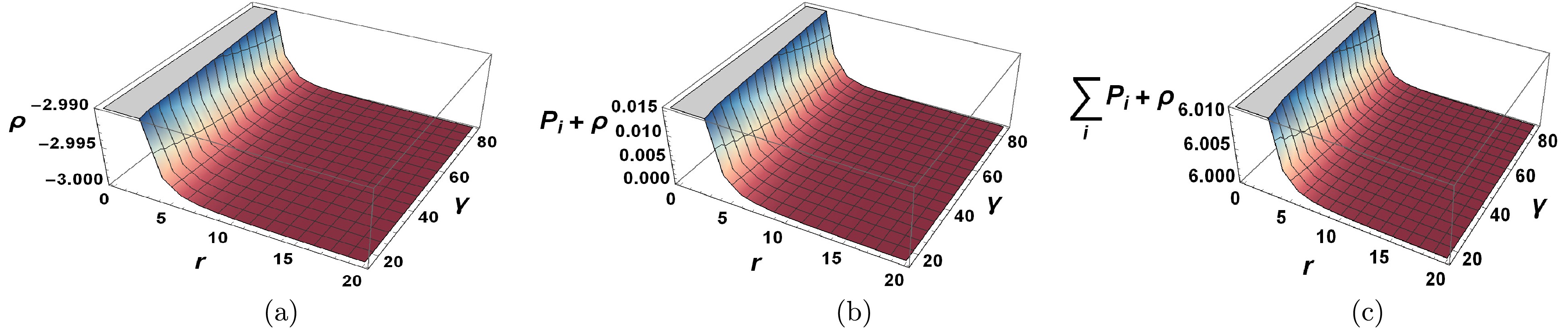 (19) Graphical analysis shows that energy conditions such as WEC, NEC, and SEC vary as a function of the variable r (see Fig. 2). Thus, we observe that for each choice of values of ω with a range of values of γ, the WEC is satisfied for the considered case with
