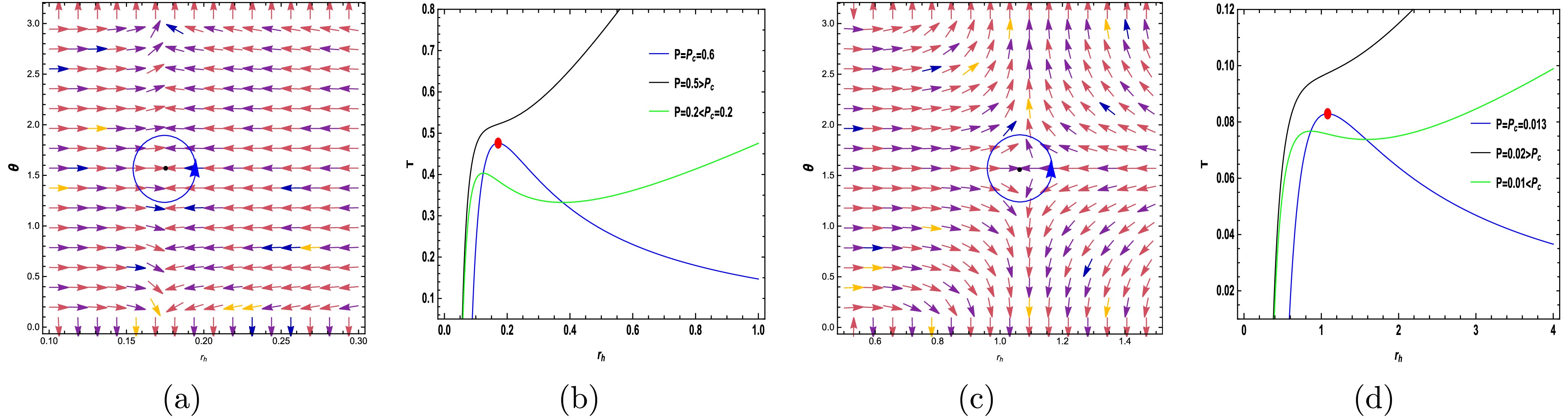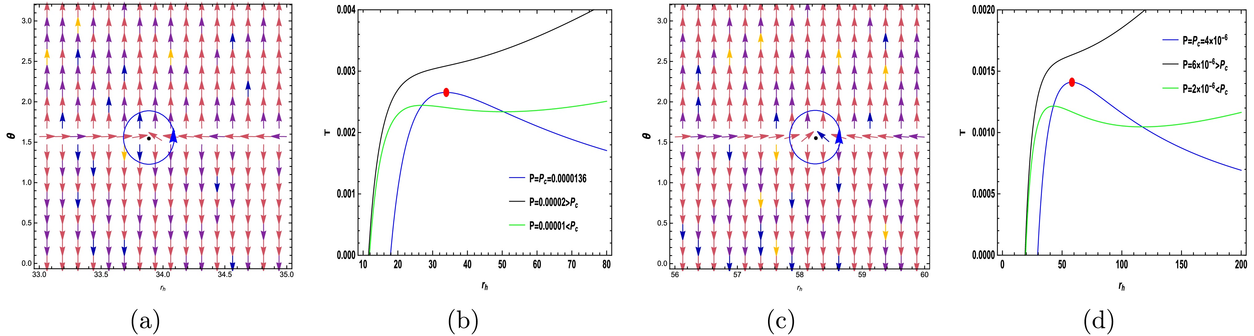 $ \left(\dfrac{\partial T}{\partial r_{H}}\right)_{P, \xi} = 0 $ . To study the topological charge, the thermodynamic function Φ is defined as$ \begin{array}{*{20}{l}} \begin{split} \Phi = \frac{1}{\sin \theta} T(r_H, \xi), \end{split} \end{array} $