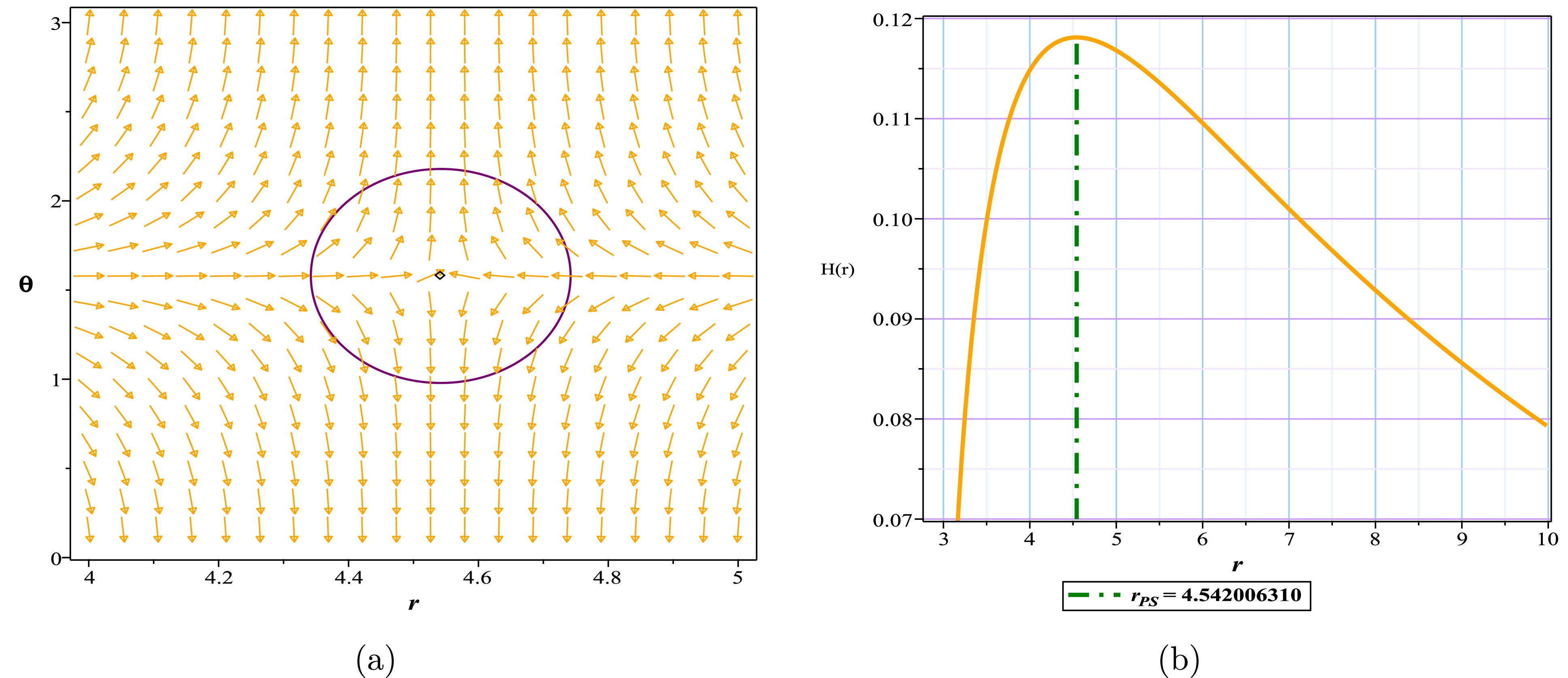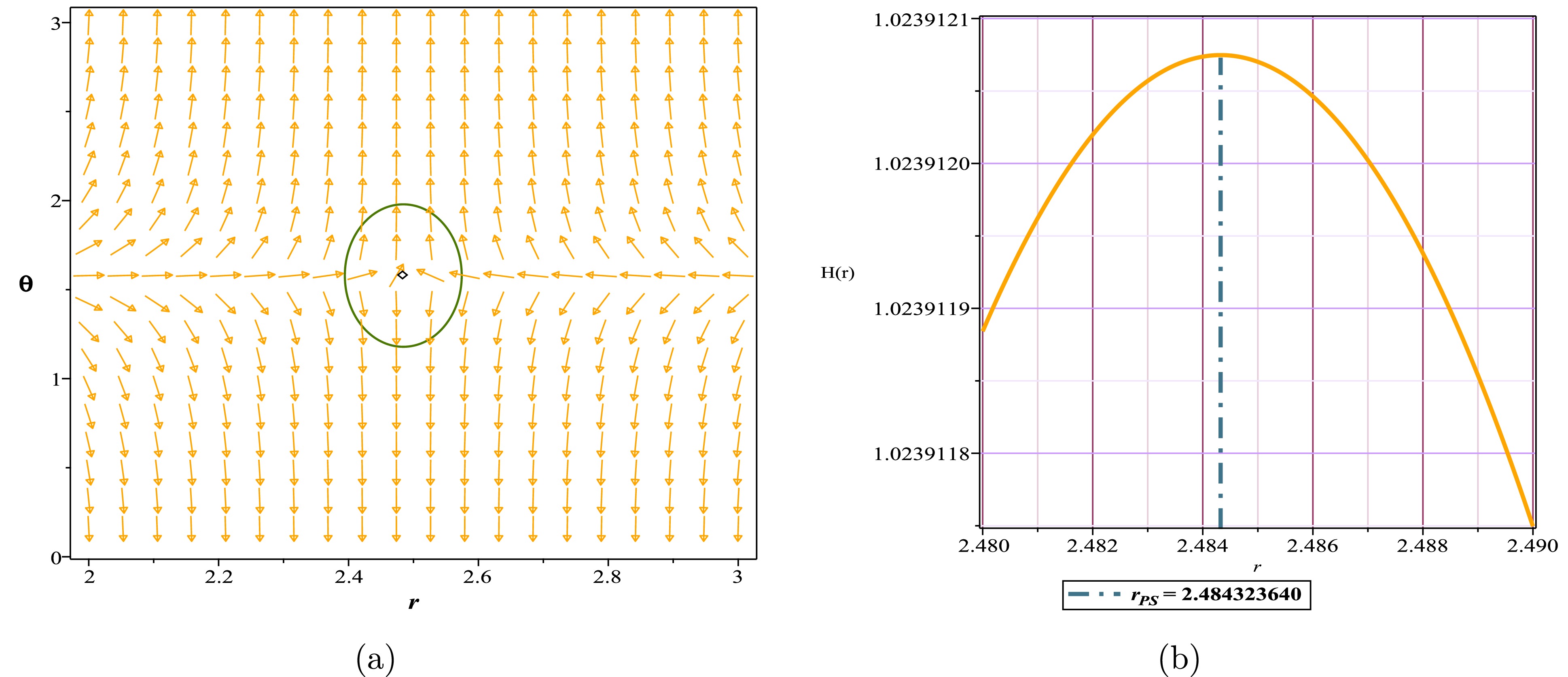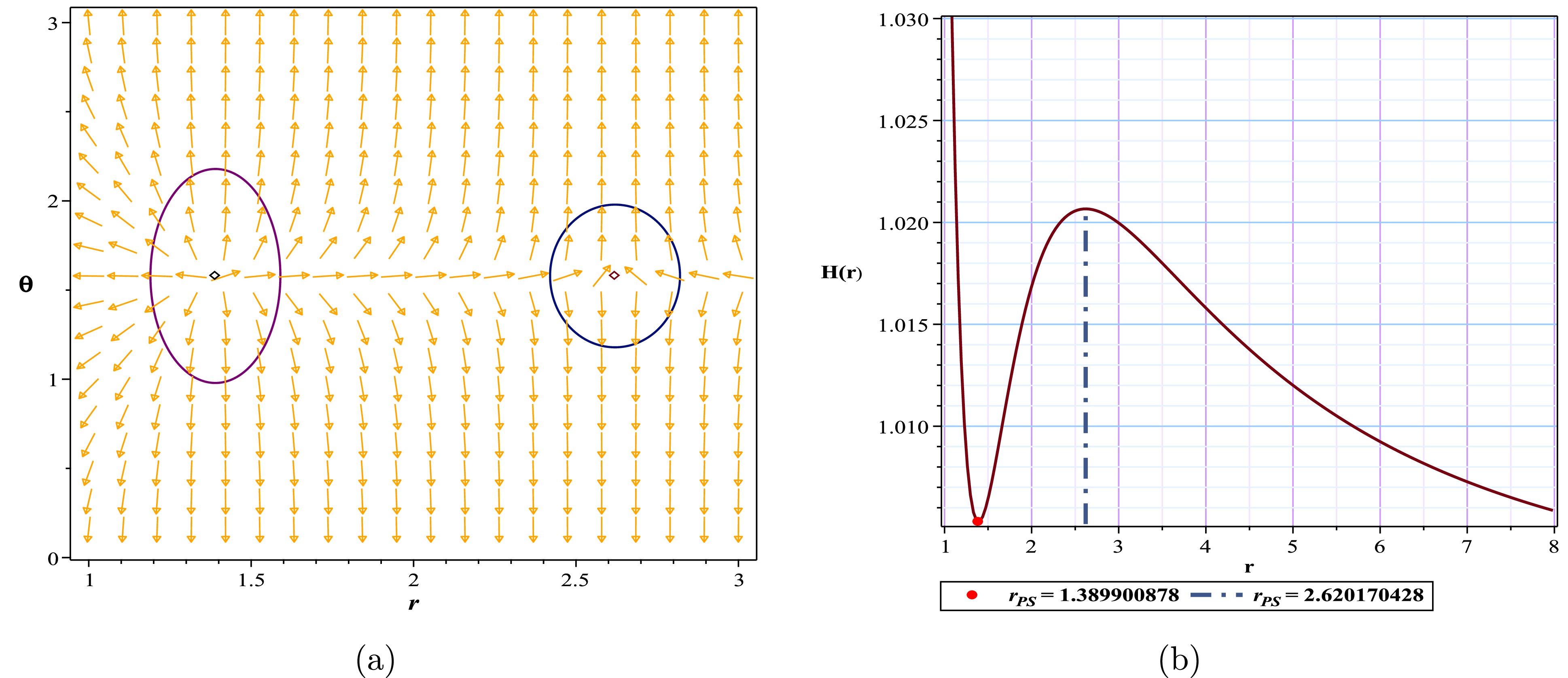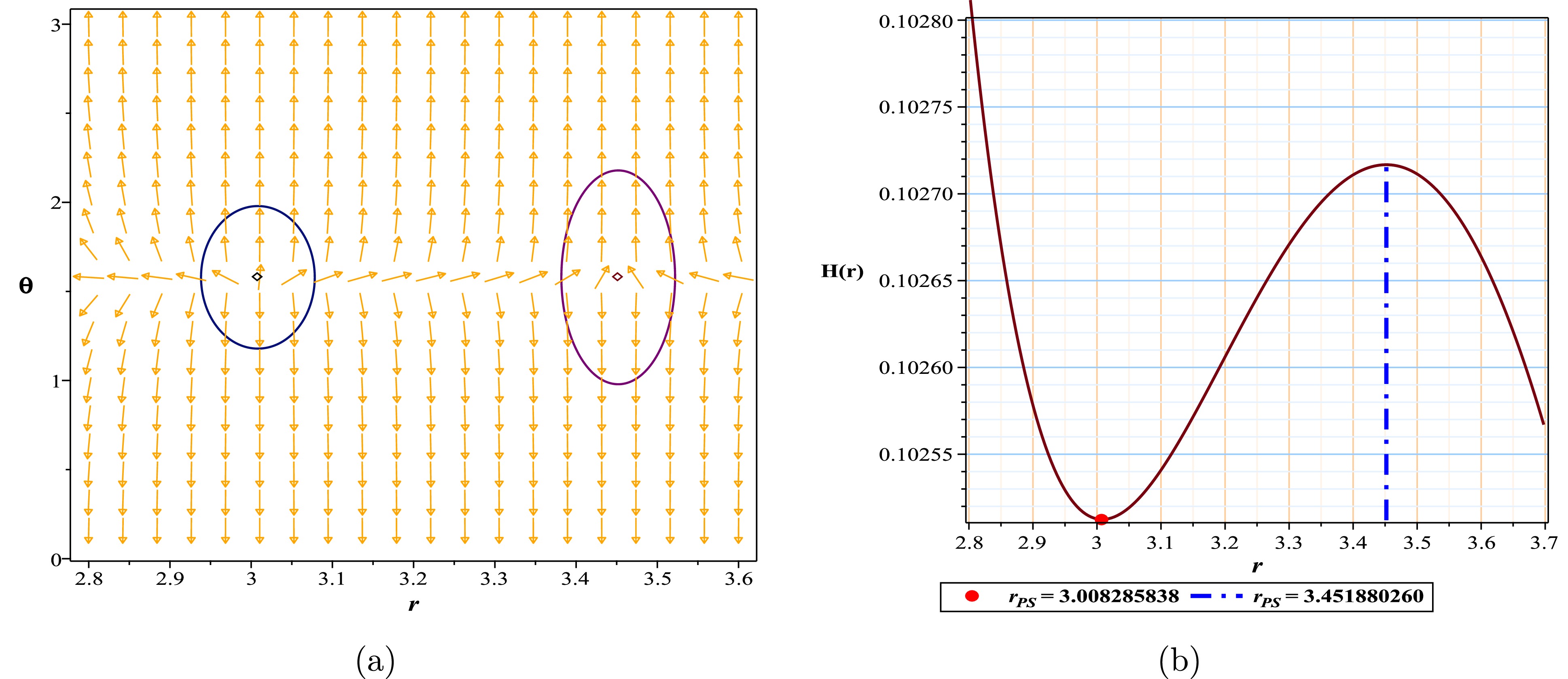 $(r-\theta)$ plane, the photon spheres are located at$ (r,\theta)=(1.594492202,~1.57)$ for (a) with respect to$(q=0.9,~m=1,~\alpha_{2}=-1,~\alpha_{3}=4)$ and$ (r,\theta)=(1.416014166,~1.57)$ ;$ (r,\theta)=(1.418051264,~1.57)$ for (b) with respect to$(q=0.9,~m=1,~\alpha_{2}=-1,~\alpha_{3}=-3.2541)$ . -