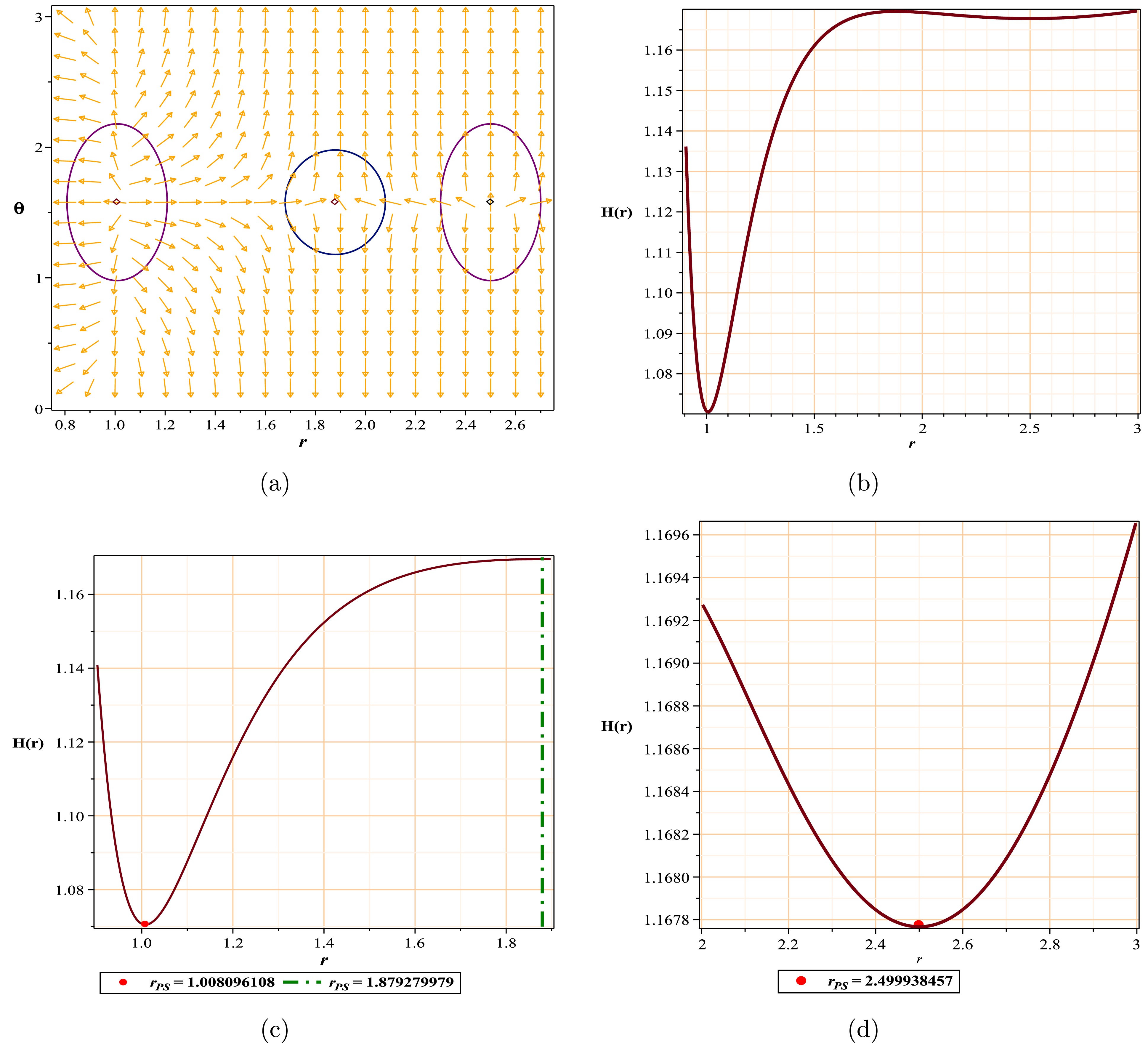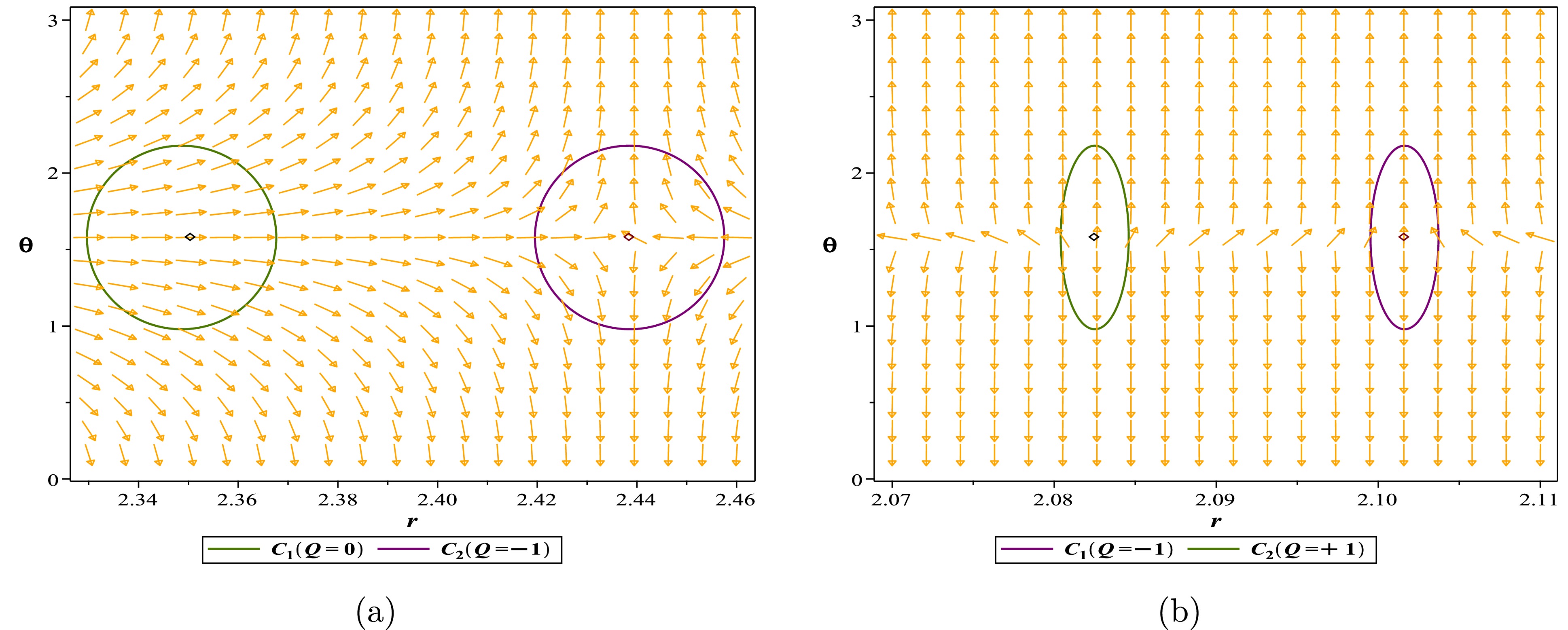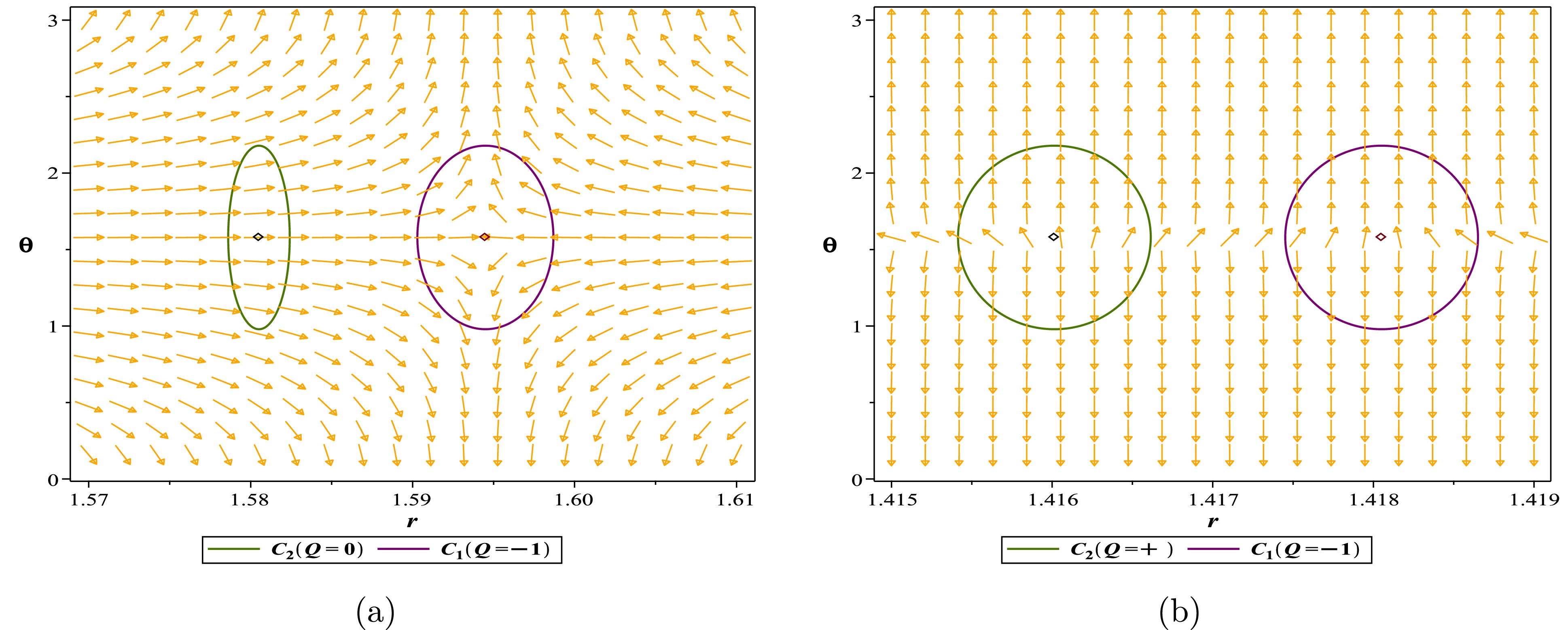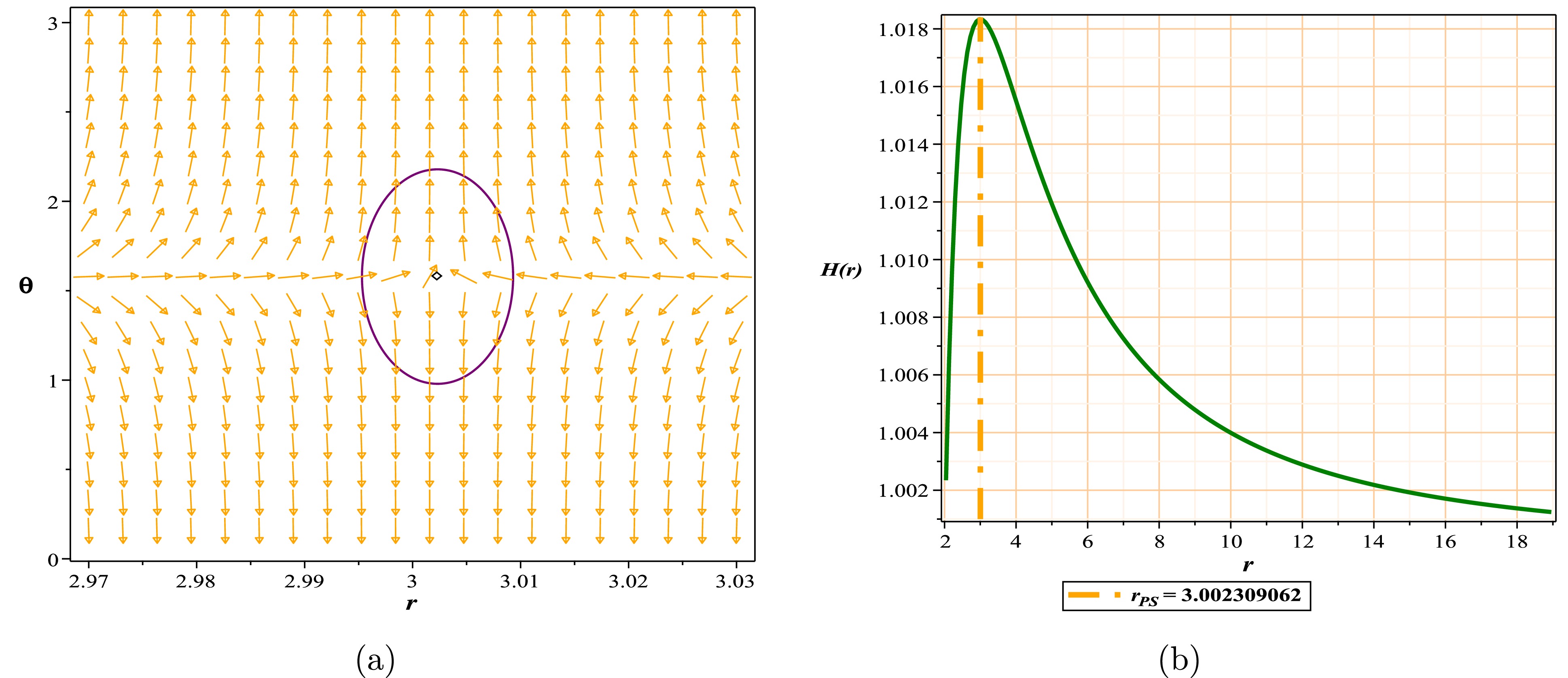 $(r-\theta)$ plane, the photon spheres are located at$ (r,\theta)=(1.594492202,~1.57)$ for (a) with respect to$(q=0.9,~m=1,~\alpha_{2}=-1,~\alpha_{3}=4)$ and$ (r,\theta)=(1.416014166,~1.57)$ ;$ (r,\theta)=(1.418051264,~1.57)$ for (b) with respect to$(q=0.9,~m=1,~\alpha_{2}=-1,~\alpha_{3}=-3.2541)$ . -