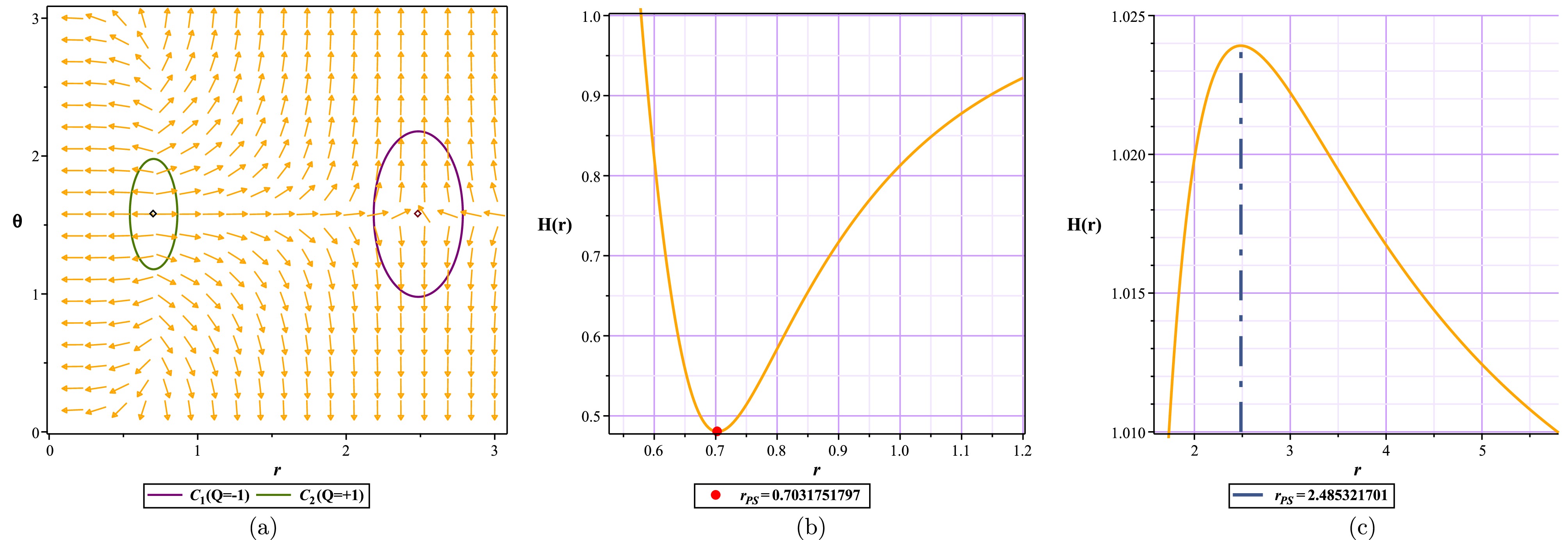 $(r-\theta)$ plane, the photon spheres are located at$(r,\theta)=(0.7031751797,~1.57)$ ,$(r,\theta)=(2.483792443,~1.57)$ for (a) with respect to$(q=0.8,~m=1,~a=-1,~l=1)$ ; (b), (c) topological potential H(r) for the Euler-Heisenberg black hole model.Euler-Heisenberg-AdS black holes Fix parametes Conditions *TTC $(R_{\rm PLPS})$