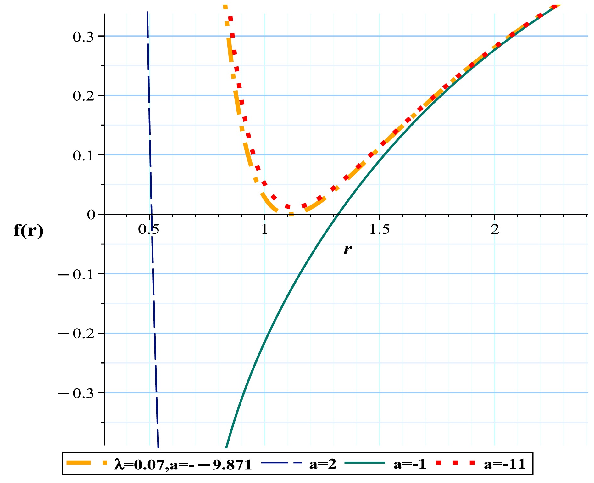 (34) where m is the ADM mass, q is the electric charge, λ is the parameter of intensity of PFDM, and a represents the strength of the QED correction. The behavior of the metric for different values of a is shown in Fig. 11. With respect to Eqs. (21) and (22) and from Eqs. (15) and (16), we have