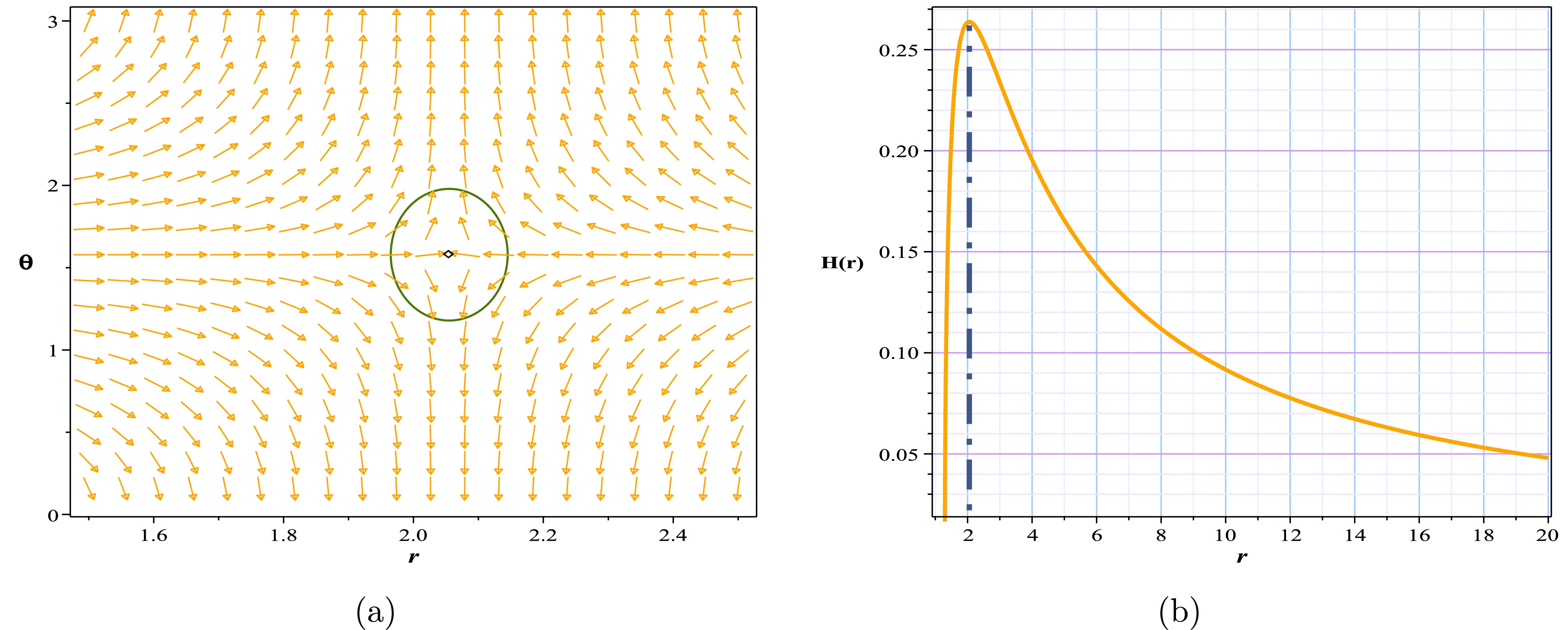 $(r-\theta)$ plane, the photon spheres are located at$ (r,\theta)=(2.055057,~1.57)$ for (a) with respect to$(q=0.8,~m=1,~a=-0.51473,~l=1,~\lambda=0.07)$ ; (b) topological potential H(r) for the Euler-Heisenberg black hole surrounded by PFDM.Regardless of the impact of the AdS radius, which we have admittedly examined to a lesser extent in this article, the comparison of the results in Tables 4 and 5 with Table 3 shows that the addition of PFDM to the model has caused a significant increase in the range affected by black hole behavior. Given the negative value of a, which signifies a greater influence of the electric field, when dark matter is absent from the model (as shown in Table 3), even very small values of a rapidly expand the domain of gravitational dominance. Consequently, a gravitational minimum emerges swiftly beyond the event horizon, leading to the model becoming a naked singularity. As observed in Table 3, the domain of dominance of this naked singularity is significantly extensive owing to the increase in the parameter within a considerably large negative range. However, in the presence of dark matter (as indicated in Tables 4 and 5), this structure appears to act as a reverse agent, preventing the rapid growth and expansion of the model's gravitational domain. Thus, as evident, we maintain the conditions for the existence of a black hole with an unstable photon sphere over a large range of negative a values. In other words, the inclusion of dark matter appears to somewhat prevent the formation of gravitational minima over a larger range, which is an intriguing effect.