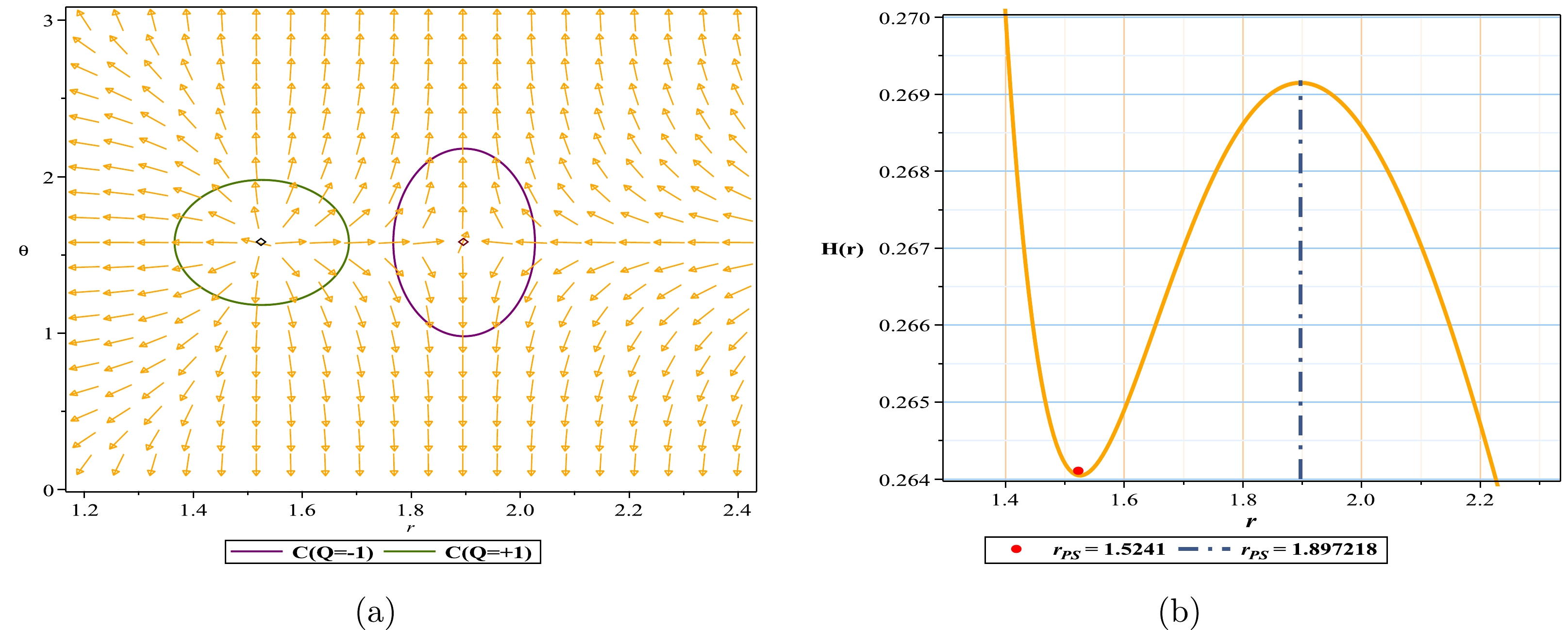 $(r-\theta)$ plane, the photon spheres are located at$ (r,\theta)=(2.484328812, ~1.57)$ for (a) with respect to$(q=0.8, ~m=1,~a=-0.51473,~l=1)$ ; (b) topological potential H(r) for the Euler-Heisenberg black hole model.