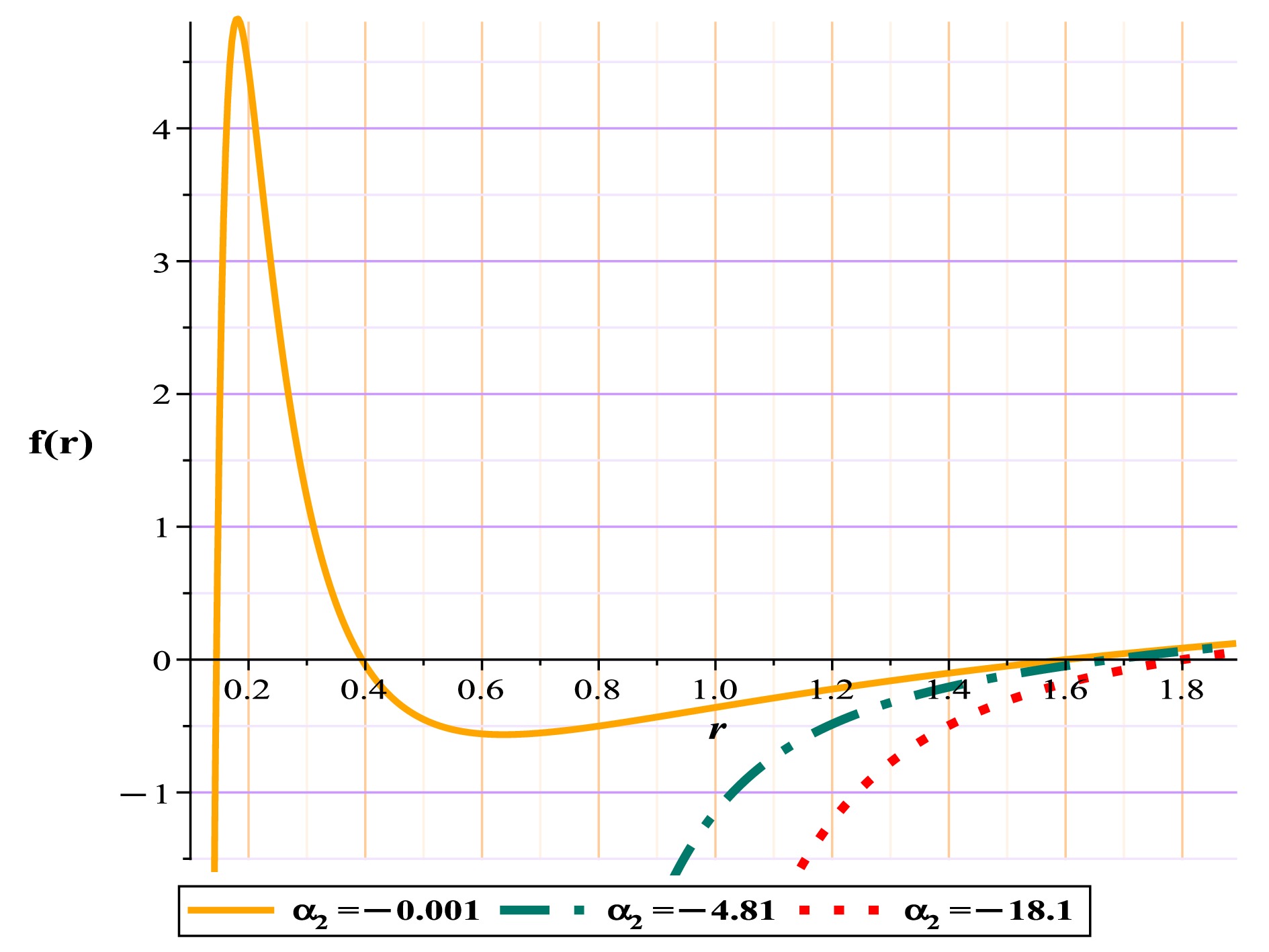 $ \alpha_{2} $ represents dimensional constants, m is mass, and q is charge. The behavior of the metric for different values of$ \alpha_{2} $ is shown in Fig. 14. With respect to Eqs. (21) and (22) and from Eqs. (15) and (16), we have$ H = \frac{\sqrt{25-\dfrac{50 M}{r}+\dfrac{25 q^{2}}{r^{2}}+\dfrac{10 q^{4} \alpha_{2}}{r^{6}}}}{5 \sin \left(\theta \right) r}, $